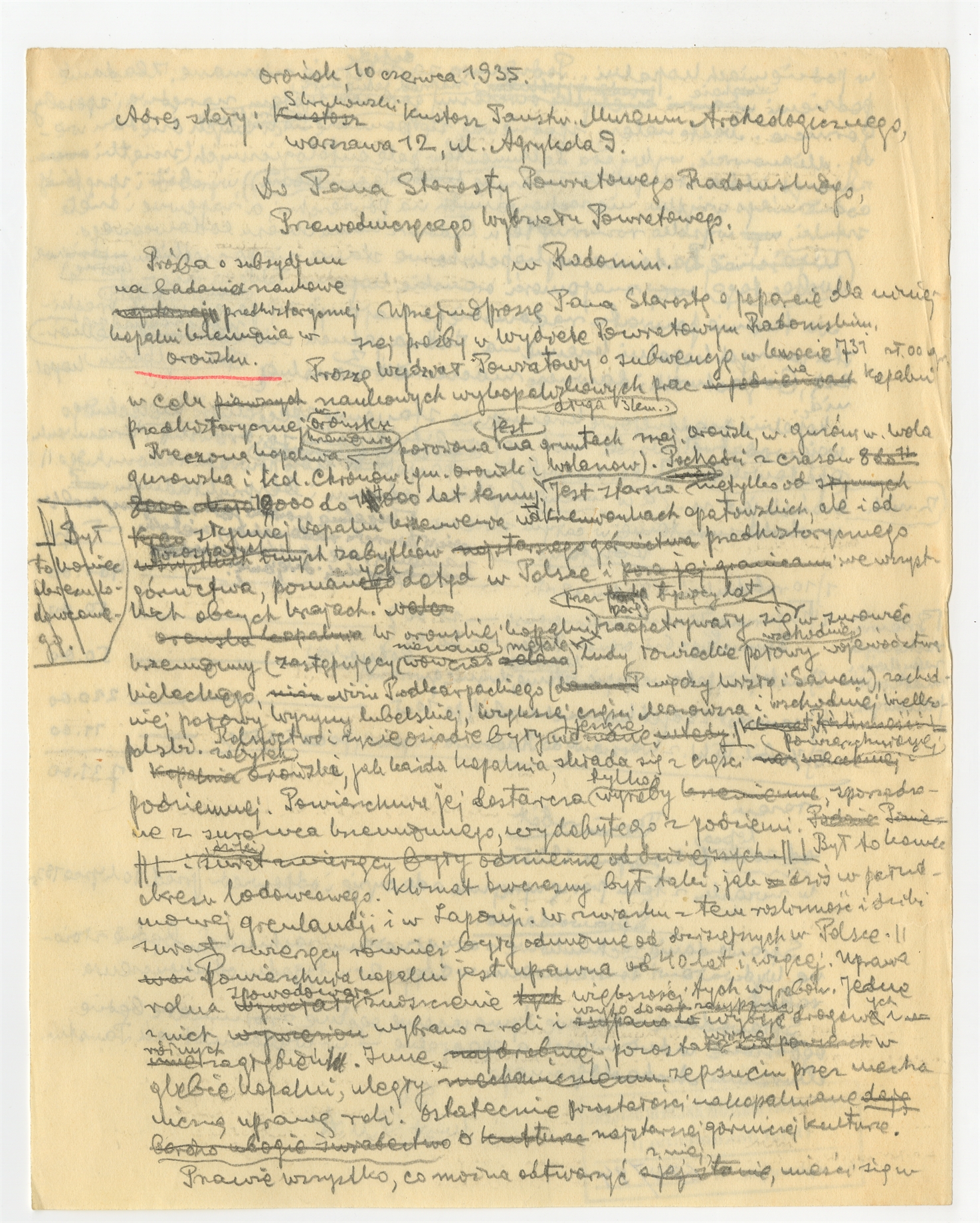 Rękopis - brudnopis pisma prof. Stefana Krukowskiego do Starosty Powiatowego Radomskiego Orońsk 10 VI 1935 r. - "Prośba o subsydium na badania naukowe…"