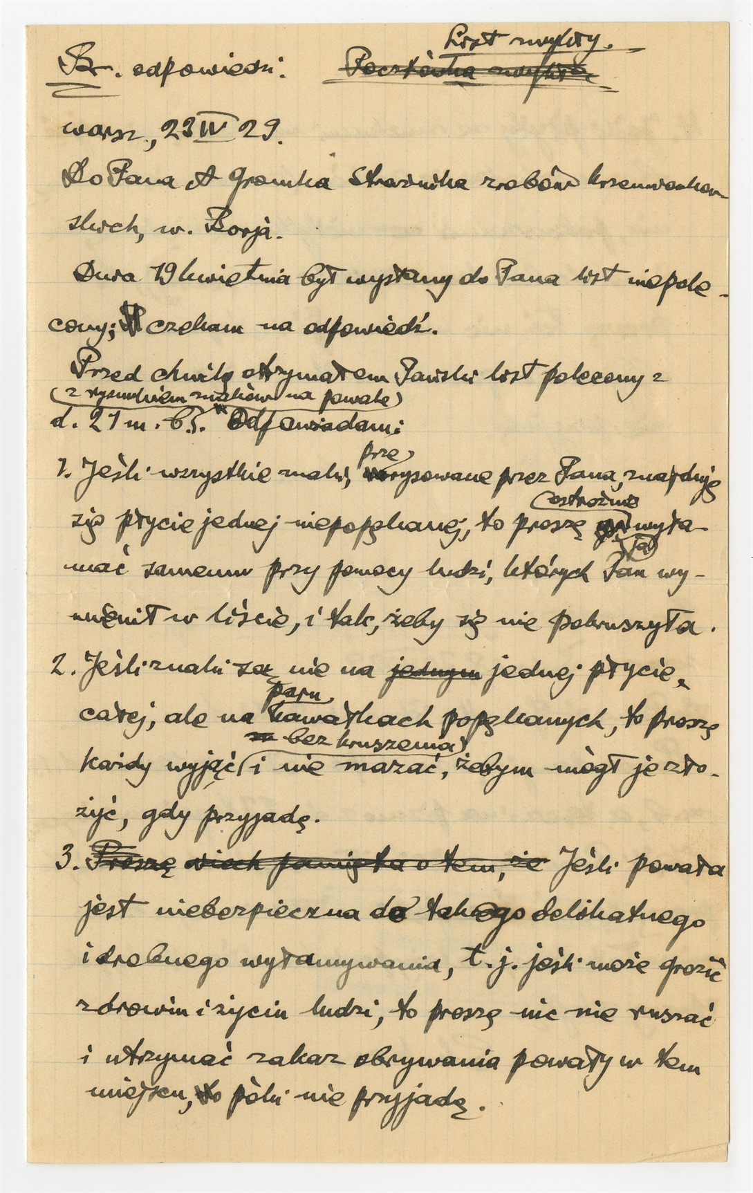 Rękopis-brudnopis pisma prof. Stefana Krukowskiego skierowanego do "Pana A. Gromka Strażnika zrobów krzemionkowskich w. Borja" z dnia 23 kwietnia [19]29 r.