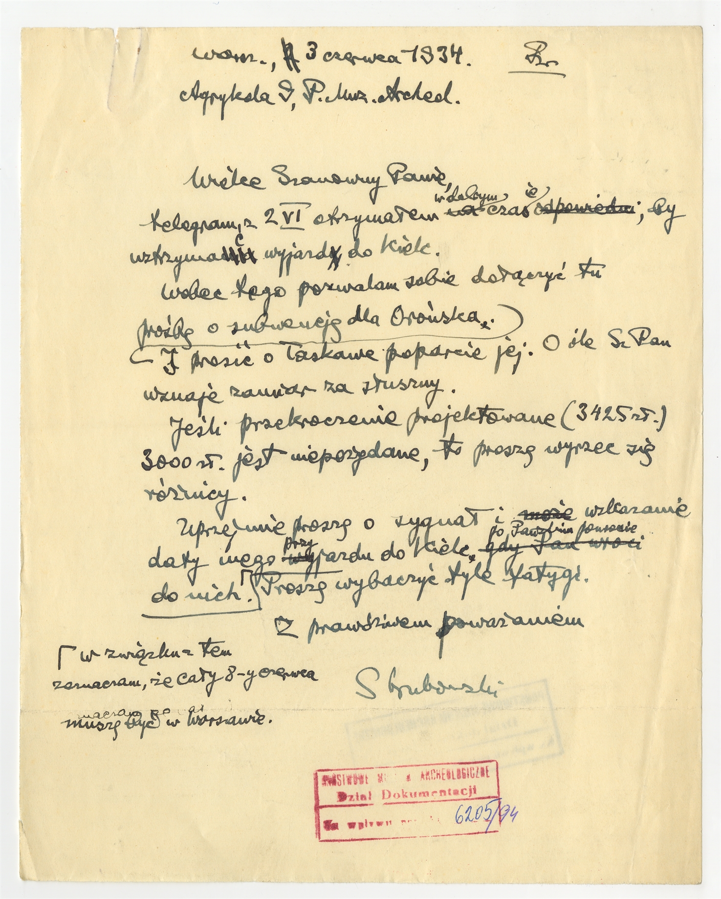 Rękopis - brudnopis pisma prof. Stefana Krukowskiego w sprawie poparcia prośby o subsydia dla Orońska Warszawa 3 VI 1934 r.