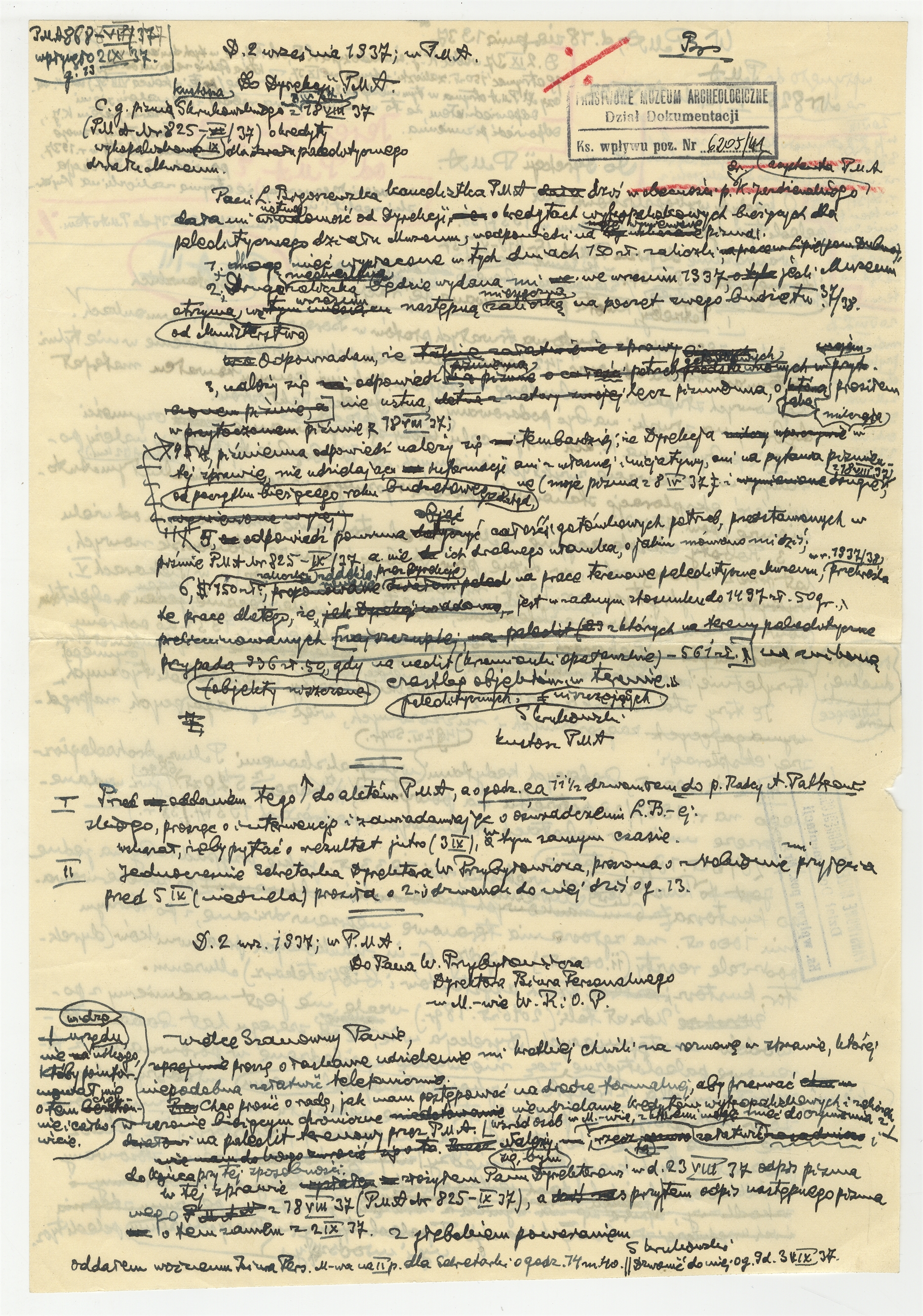Rękopis-brudnopis pisma prof. Stefana Krukowskiego (wraz z notatkami) z dn. 2 września 1937 r. skierowanego do "Dyrekcji PMA" pismo w sprawie: "c.d pism kustosza […] o kredyty wykopaliskowe dla paleolitycznego działu Muzeum"