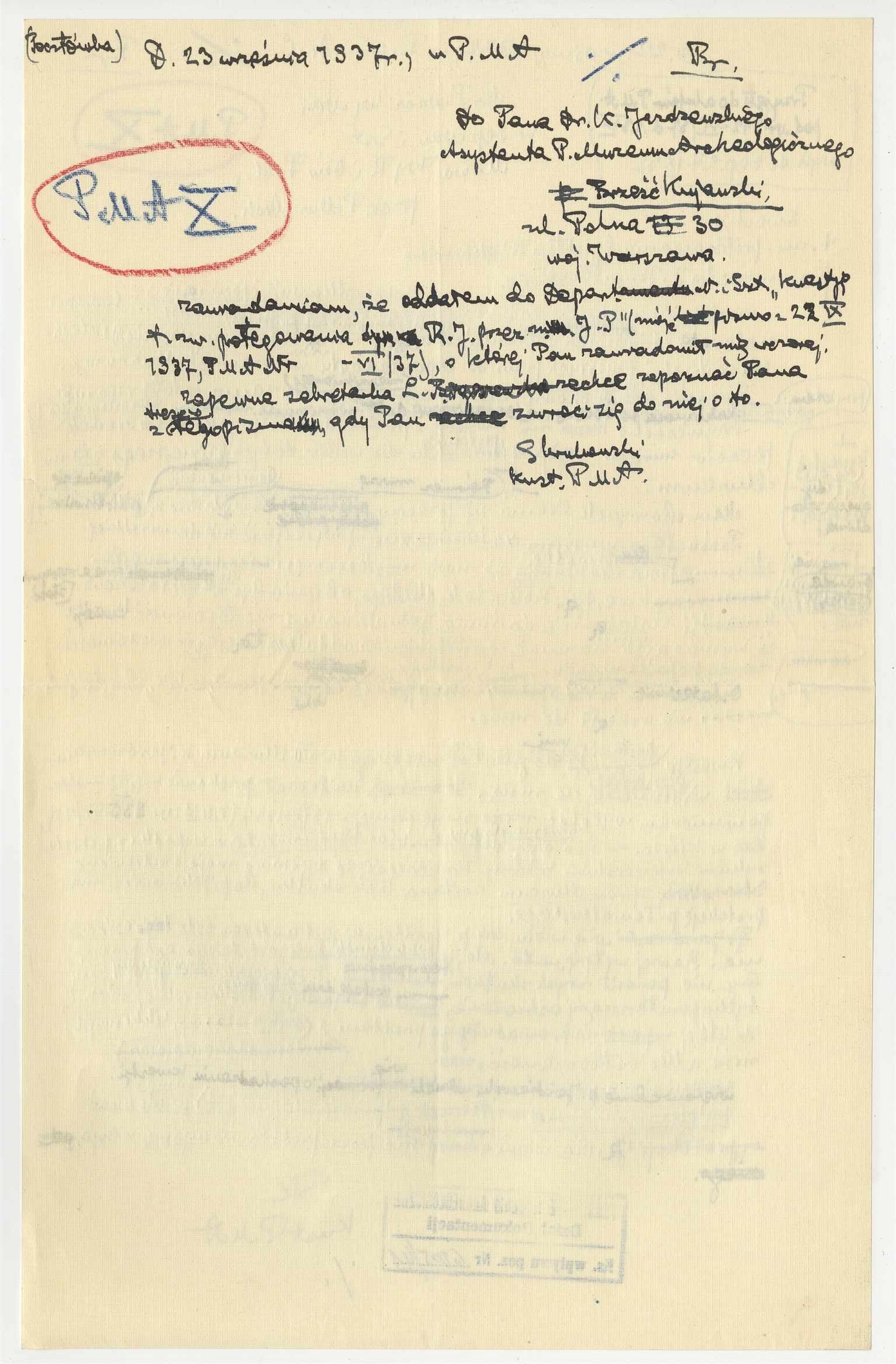 Rękopis-brudnopis pisma prof. Stefana Krukowskiego z dn. 23 września 1937 r. skierowanego do Dr K. Jażdżewskiego Asystenta PMA