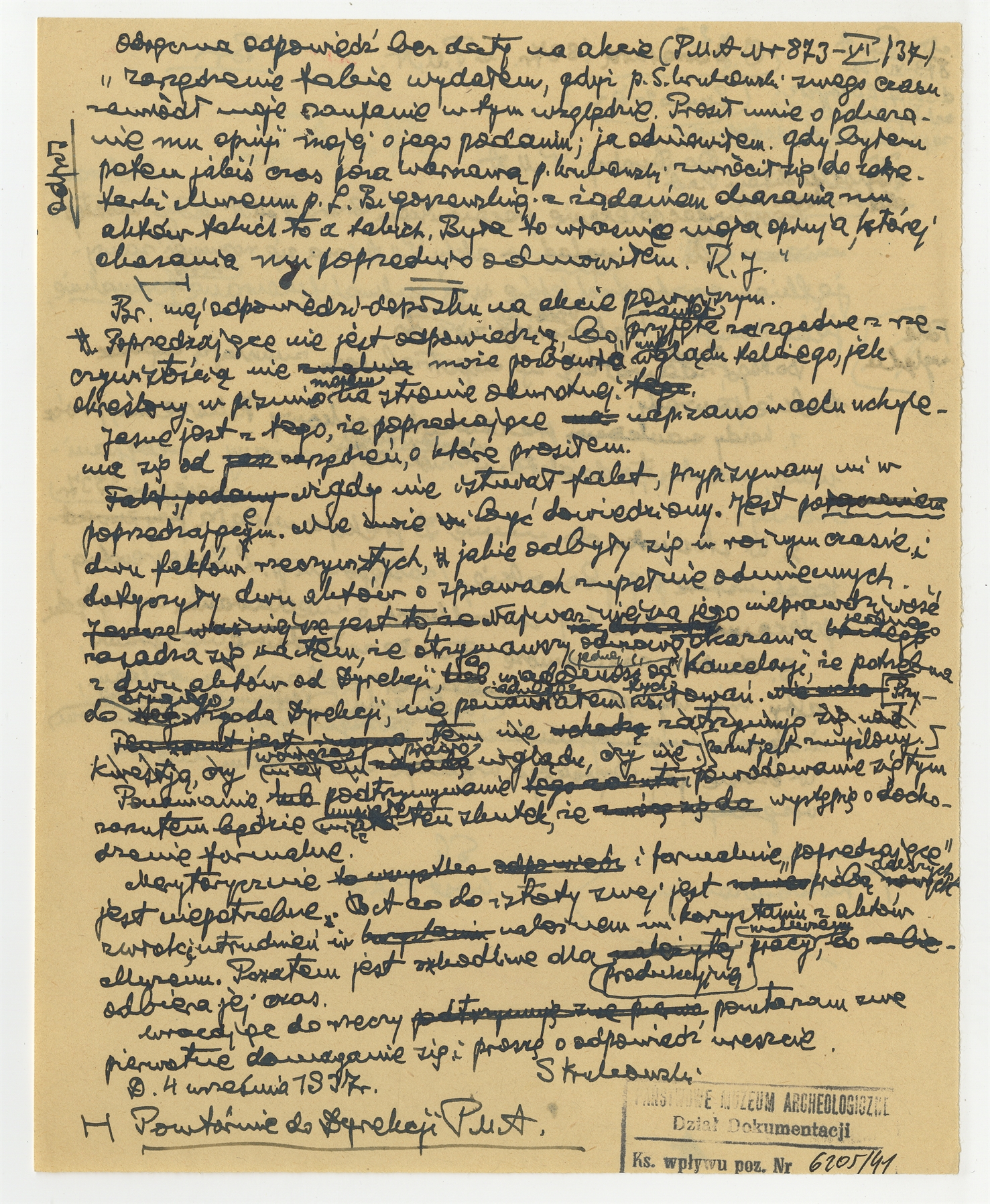 Rękopis-brudnopis pisma prof. Stefana Krukowskiego z dn. 4 września 1937 r. skierowanego do Dyrekcji PMA dotyczącego pisma PMA Nr 873-VI/31 i zawierającego jego odpis: "[…] zarządzenie takie wydałem gdyż p. S. Krukowski swego czasu […]"