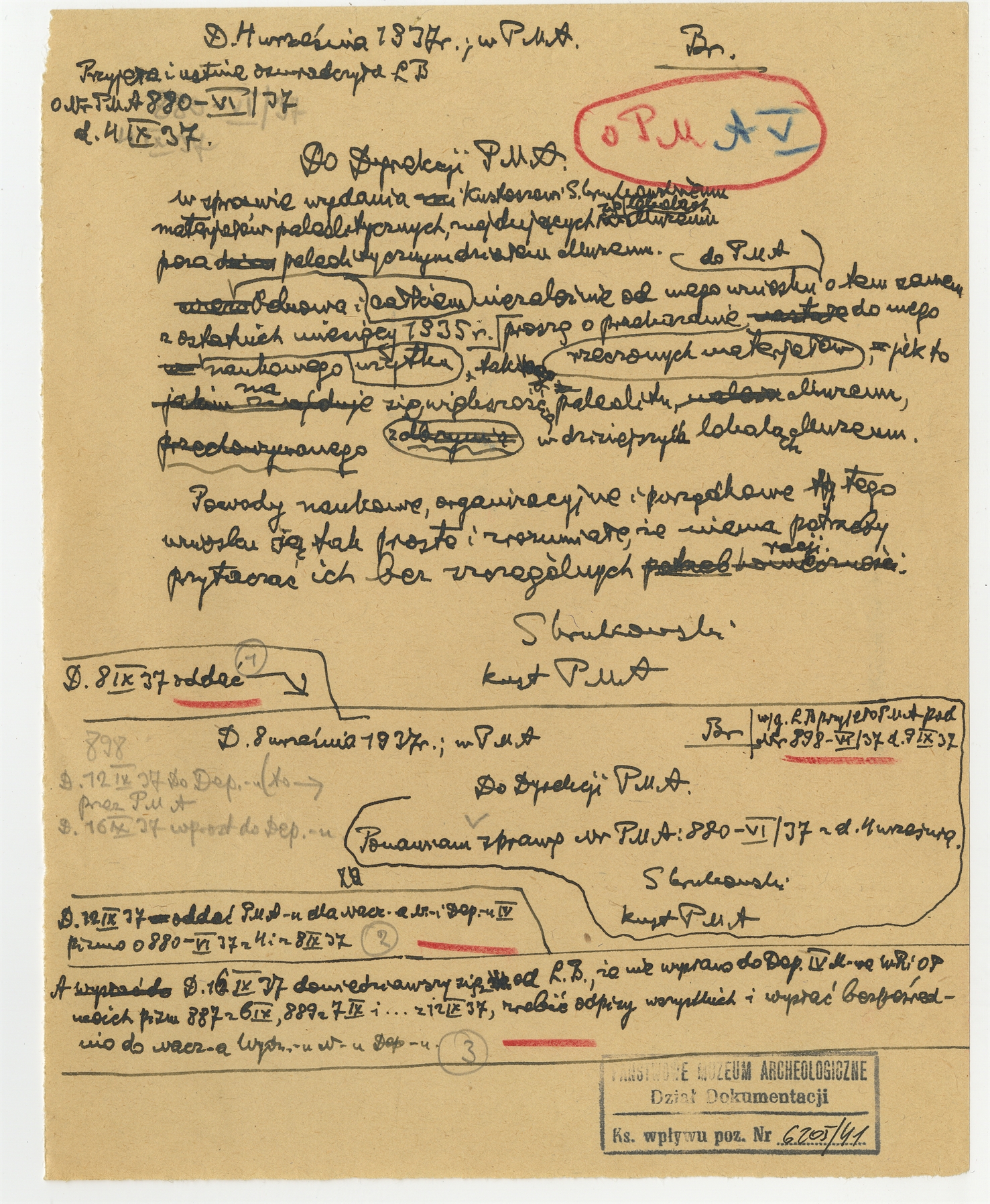 Rękopis-brudnopis pisma prof. Stefana Krukowskiego z dn. 4 września 1937 r. skierowanego do Dyrekcji PMA "[…] w sprawie wydania kustoszowi S. Krukowskiemu materiałów paleolitycznych […]"