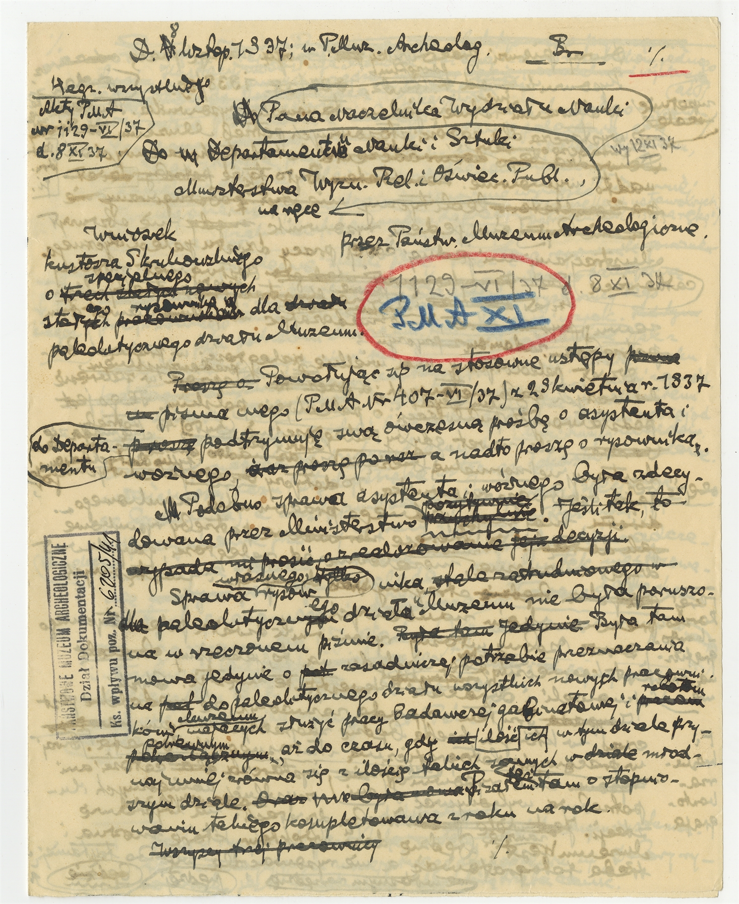 Rękopis-brudnopis pisma prof. Stefana Krukowskiego z dn. 8 listopada 1937 r. skierowanego do Naczelnika Wydziału Nauki w Departamencie Nauki i Sztuki Ministerstwa Wyznań Rel. i Oświecenia Publ. Pismo w sprawie "o specjalnego stałego rysownika dla paleolitycznego działu Muzeum"