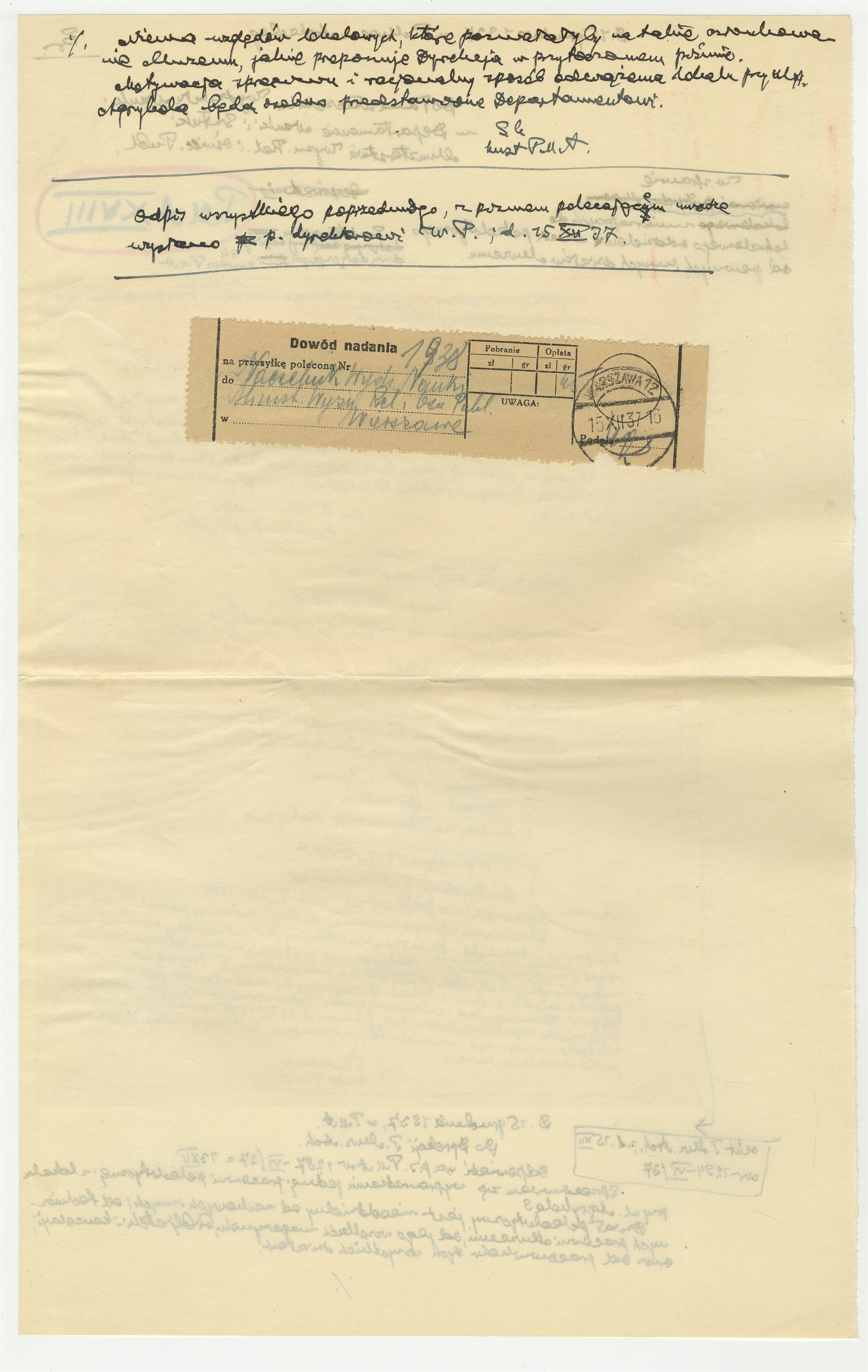 Rękopis-brudnopis pisma prof. Stefana Krukowskiego z dnia 15 grudnia 1937 r. skierowanego do Naczelnika Wydziału Nauki w Departamencie Nauki i Sztuki Ministerstwa Wyzn. Rel. i Ośw. Publ. Pismo w sprawie "[…] zmierzających do lokalowego oddzielenia działu paleolitycznego od pewnych innych działów Muzeum" (cd) wraz z dowodem nadania listu