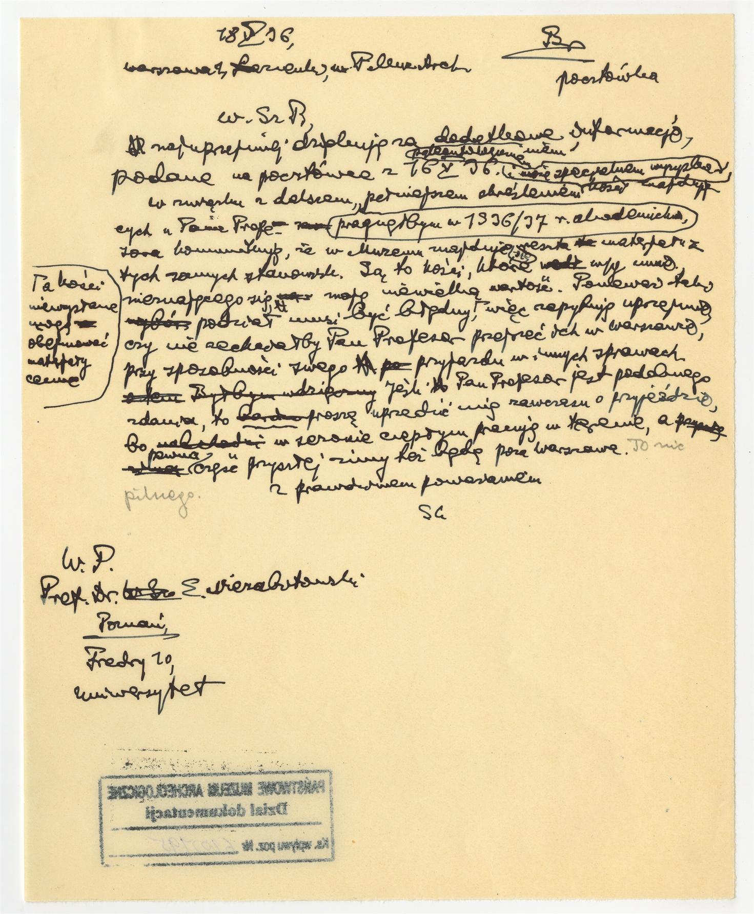 Rękopis-brudnopis pisma prof. Stefana Krukowskiego z dnia 18 V [19]36 skierowanego do prof. dr E. Niezabitowskiego: "najuprzejmiej dziękuję za dodatkowe informacje …"