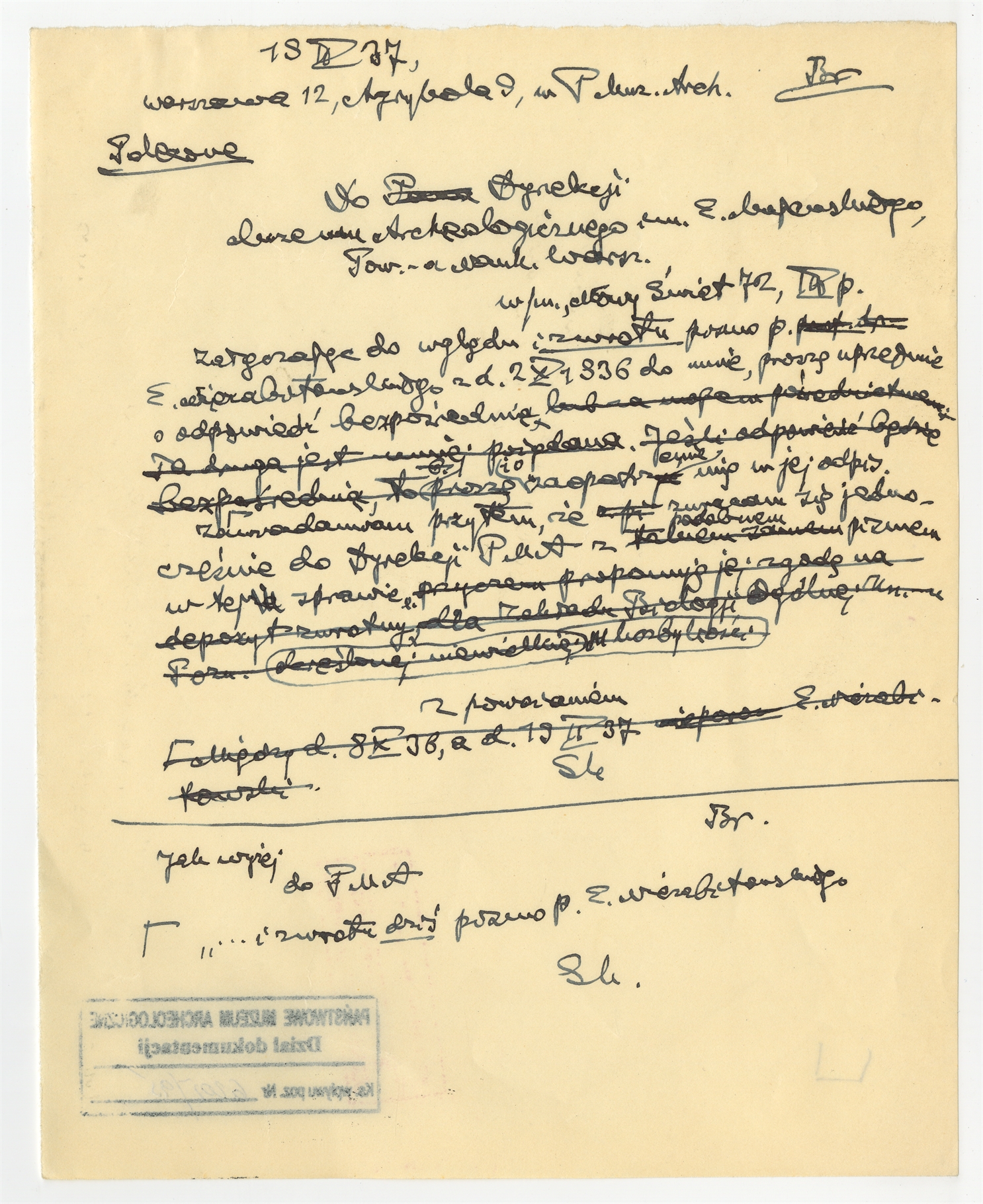 Rękopis-brudnopis pisma prof. Stefana Krukowskiego z dnia 19 II [19]37 skierowanego do "Dyrekcji Muzeum Archeologicznego im E. Majewskiego Tow-a Nauk. Warsz."
