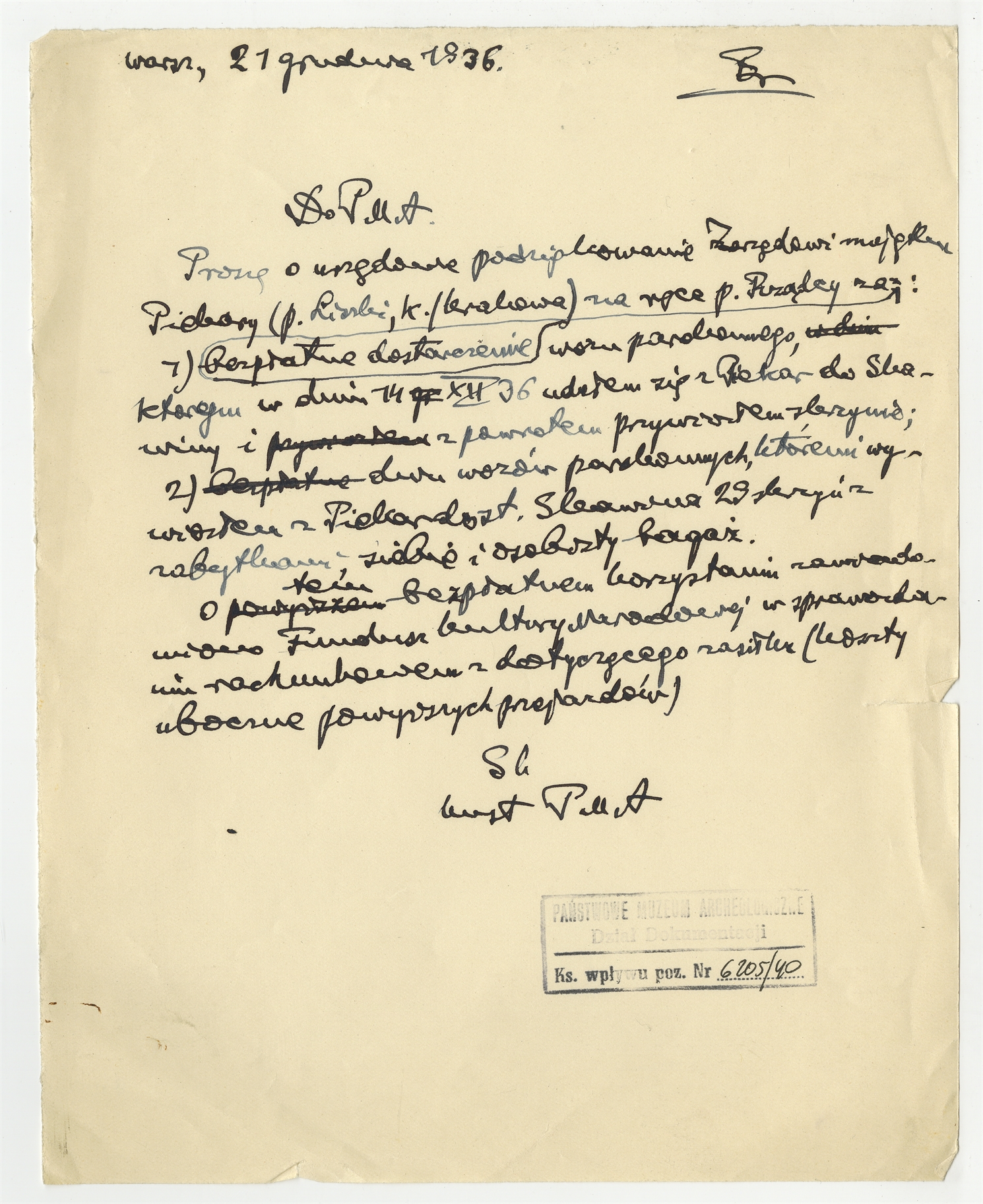 Rękopis-brudnopis pisma prof. Stefana Krukowskiego z dnia 21 grudnia 1936 r. skierowanego do PMA