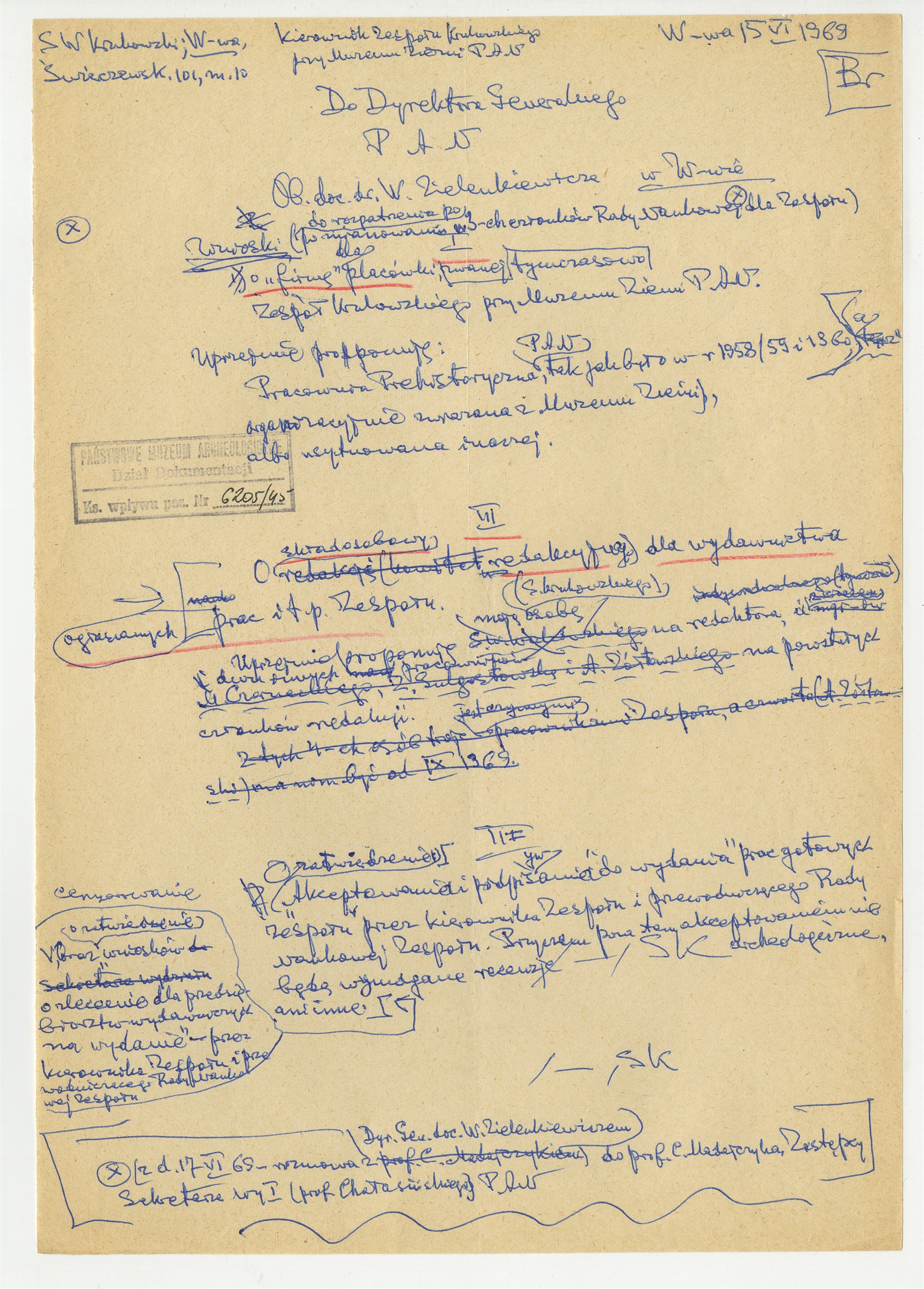 Rękopis - brudnopis pisma S. Krukowskiego "Do Dyrektora Generalnego PAN - Ob. doc. dr. W. Zielenkiewicza" w sprawie nowej nazwy dla "Zespołu Krukowskiego" składu osobowego wydawnictwa oraz prac "Zespołu" - strona 1: "Wnioski do rozpatrzenia" … "Sekretarza wy I (prof Chałasińskiego) PAN" W-wa 15 VI 1969 (bez numeru strony)