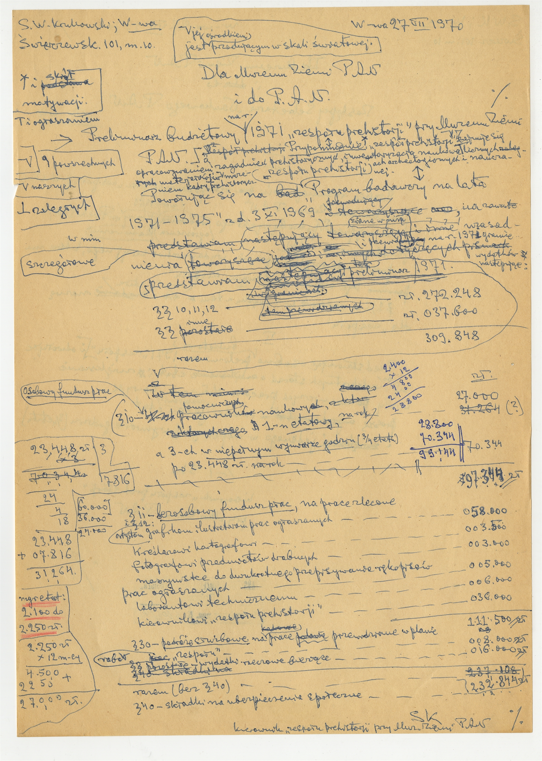Rękopis - brudnopis pisma S. Krukowskiego do Muzeum Ziemi PAN i do P.A.N. w sprawie preliminarza budżetowego na r. 1970 "zespołu prehhistorji przy Muzeum Ziemi PAN - strona 1: "Preliminarz budżetowy" … "kierownik "zespołu prehistorji" przy Muz. Ziemi PAN" W-wa 27 VII 1970 (bez numeru strony)