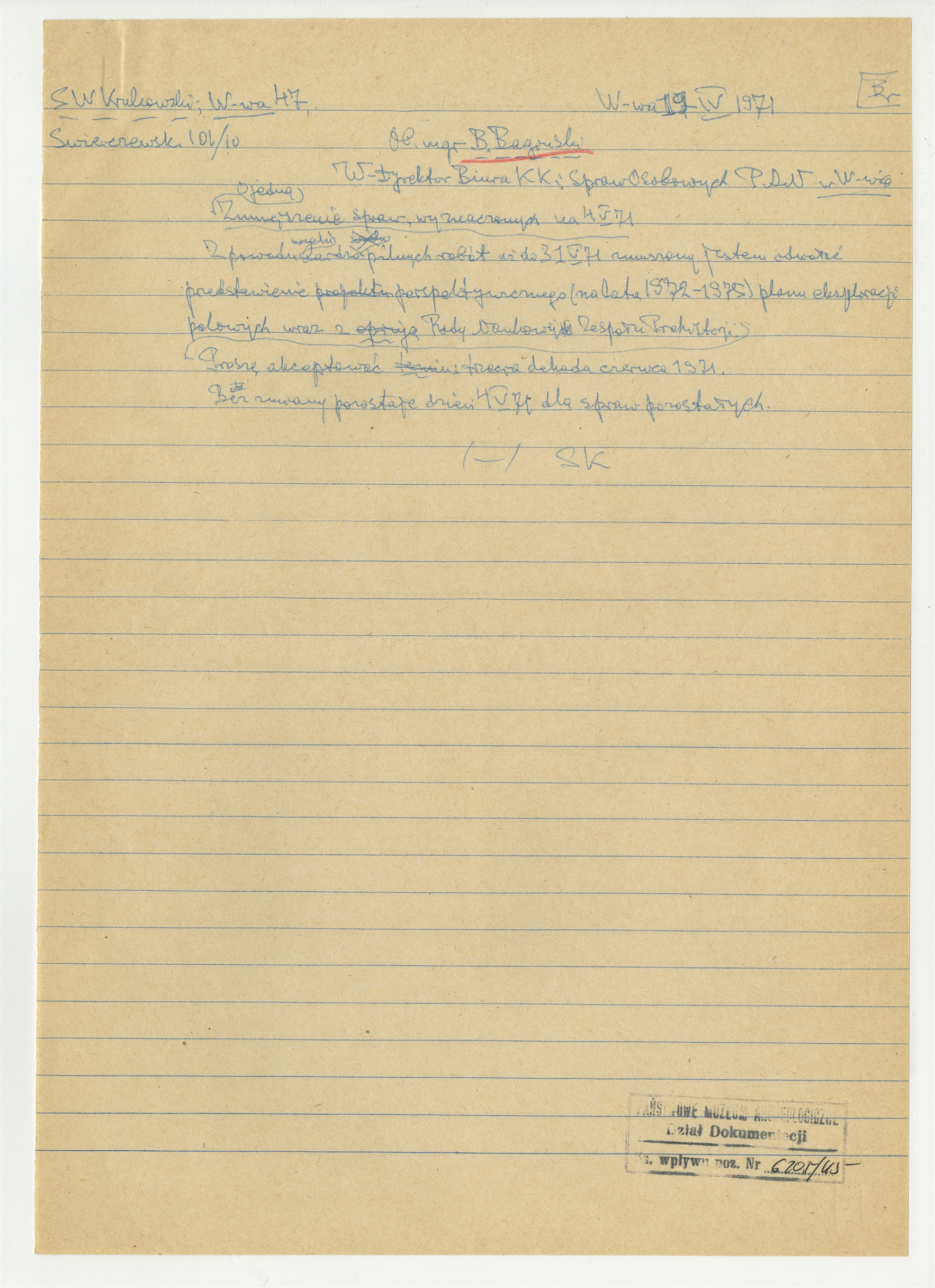 Rękopis - brudnopis pisma S. Krukowskiego do "W-Dyrektora Biura KK i Spraw Osobowych PAN w Warszawie" w sprawie "odwołania przedstawienia perspektywicznego (na lata 1972-1975) planu eksploracji polowych" - strona 1: "O jedną Zmniejszenie spraw" ... "dla spraw pozostałych" W-wa 19 IV 1971 (bez numeru strony)