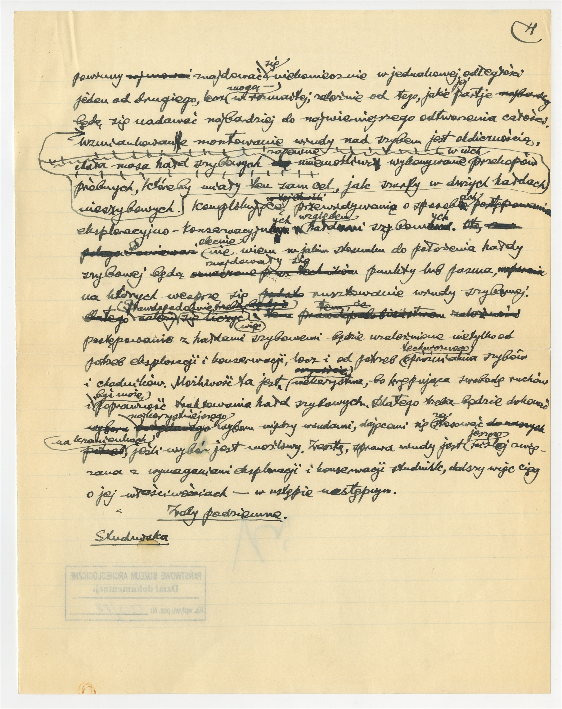 Rękopis - brudnopis pisma Stefana Krukowskiego do Kierownika Państwowego Grona Konserwatorów Zabytków Przedhistorycznych w sprawie eksploracji 1-2-u studnisk z chodnikami przyległymi na stanowisku Krzemionki Ostrowiec n/Kamienną 3 maja 1928 r. - strona 4: "(...) powinny znajdować się niekoniecznie w jednakowej odległości (...)"
