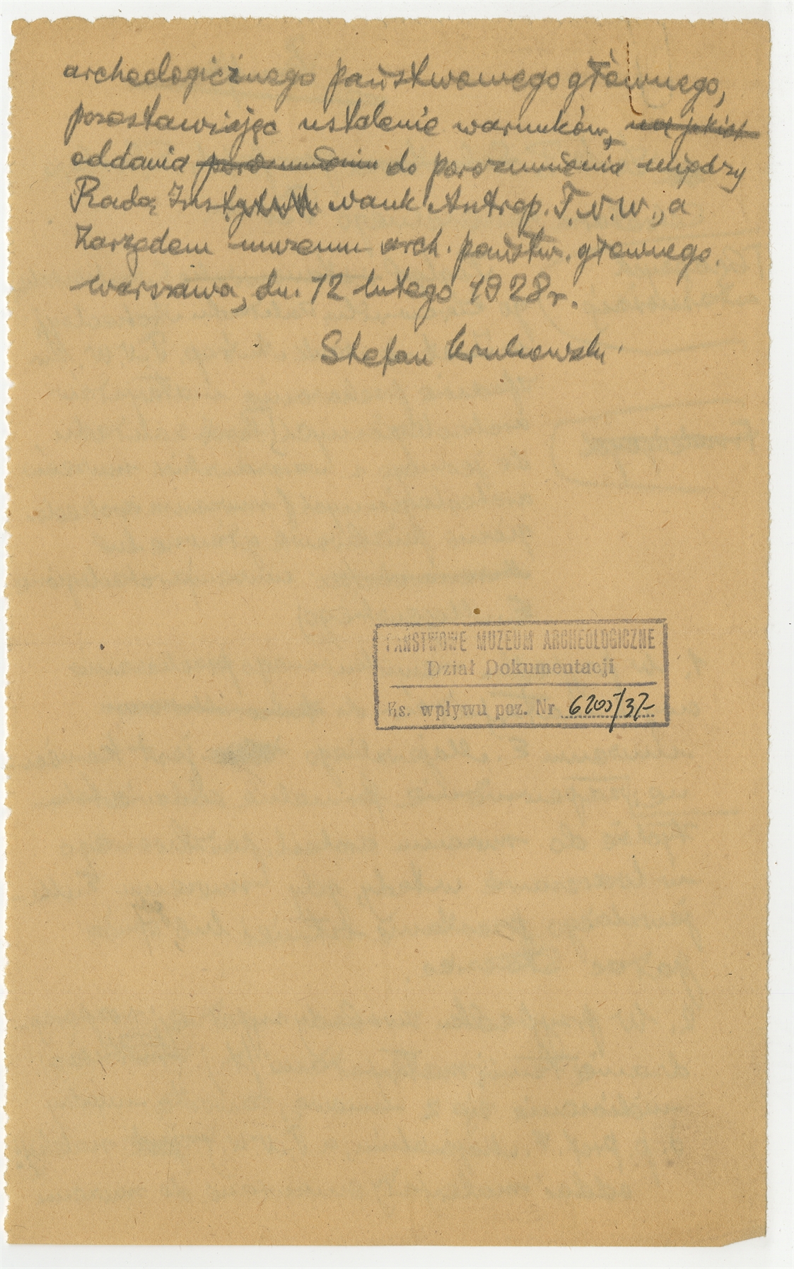 Rękopis - brudnopis pisma Stefana Krukowskiego do prof. dr. S. Szobera Sekretarza Generalnego Towarzystwa Naukowego Warszawskiego w sprawie przekazania zbiorów archeologicznych Instytutu Nauk Antropologicznych T.N.W. do Muzeum Archeologicznego im. E. Majewskiego Warszawa 12 lutego 1928 - strona 2