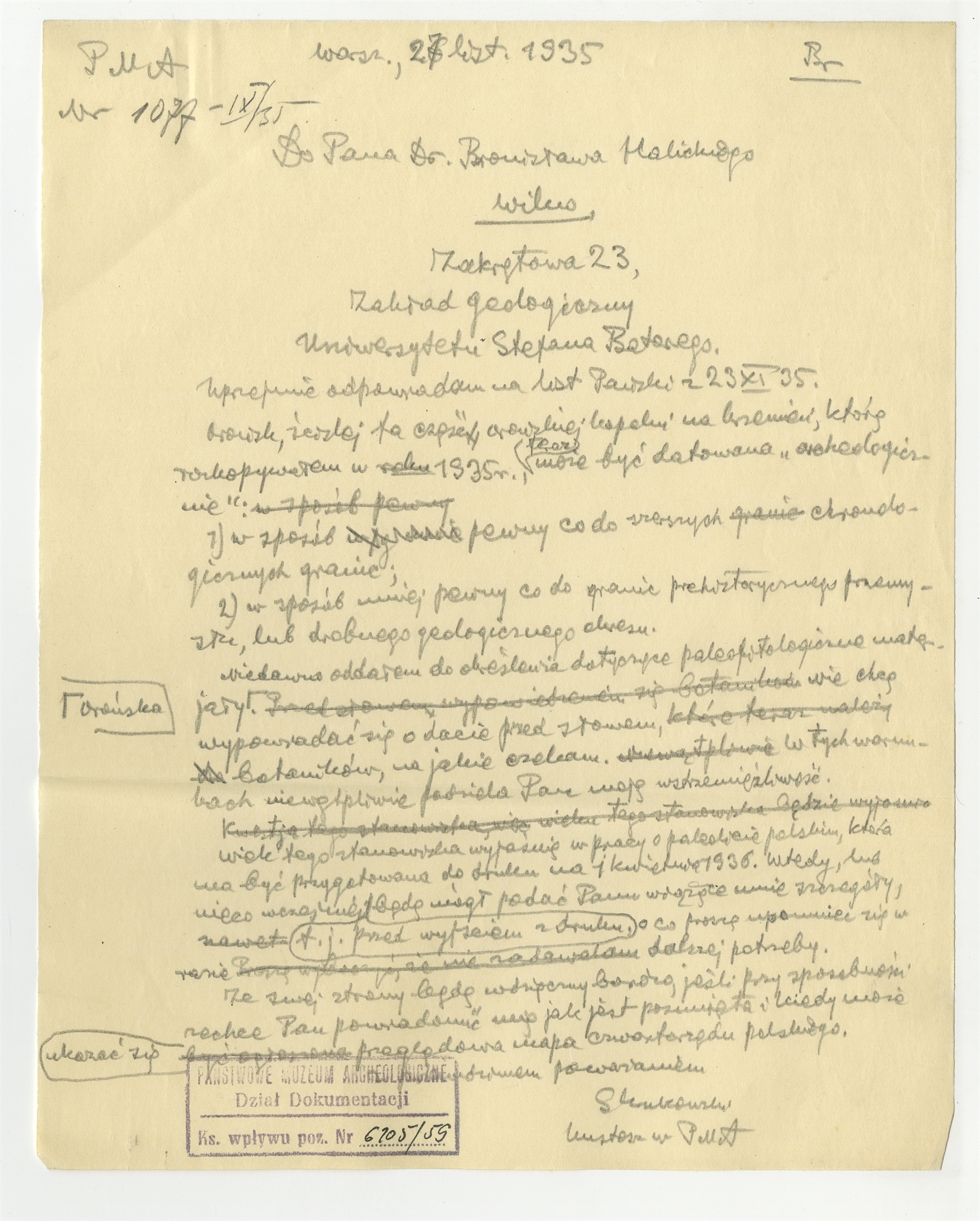 Rękopis - brudnopis pisma Stefana Krukowskiego Kustosza PMA do dr Bronisława Halickiego z Zakładu Geologicznego Uniwersytetu Stefana Batorego w Wilnie w sprawie stanowiska paleolitycznego w Orońsku Warszawa 27 listopada 1935 (nr pisma 1077-IX/35) - strona 1