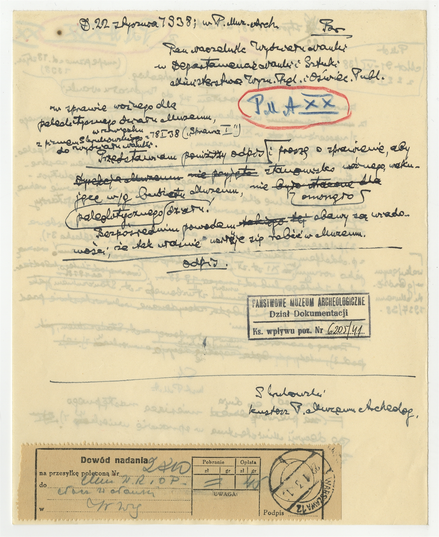 Rękopis-brudnopis pisma Stefana Krukowskiego z 22 stycznia 1938 r. skierowanego do Naczelnika Wydziału Nauki w Departamencie Nauki i Sztuki Ministerstwa Wyzn. Rel. i Oświec. Publ. Pismo w sprawie "woźnego dla paleolitycznego działu Muzeum […]" wraz z dowodem nadania