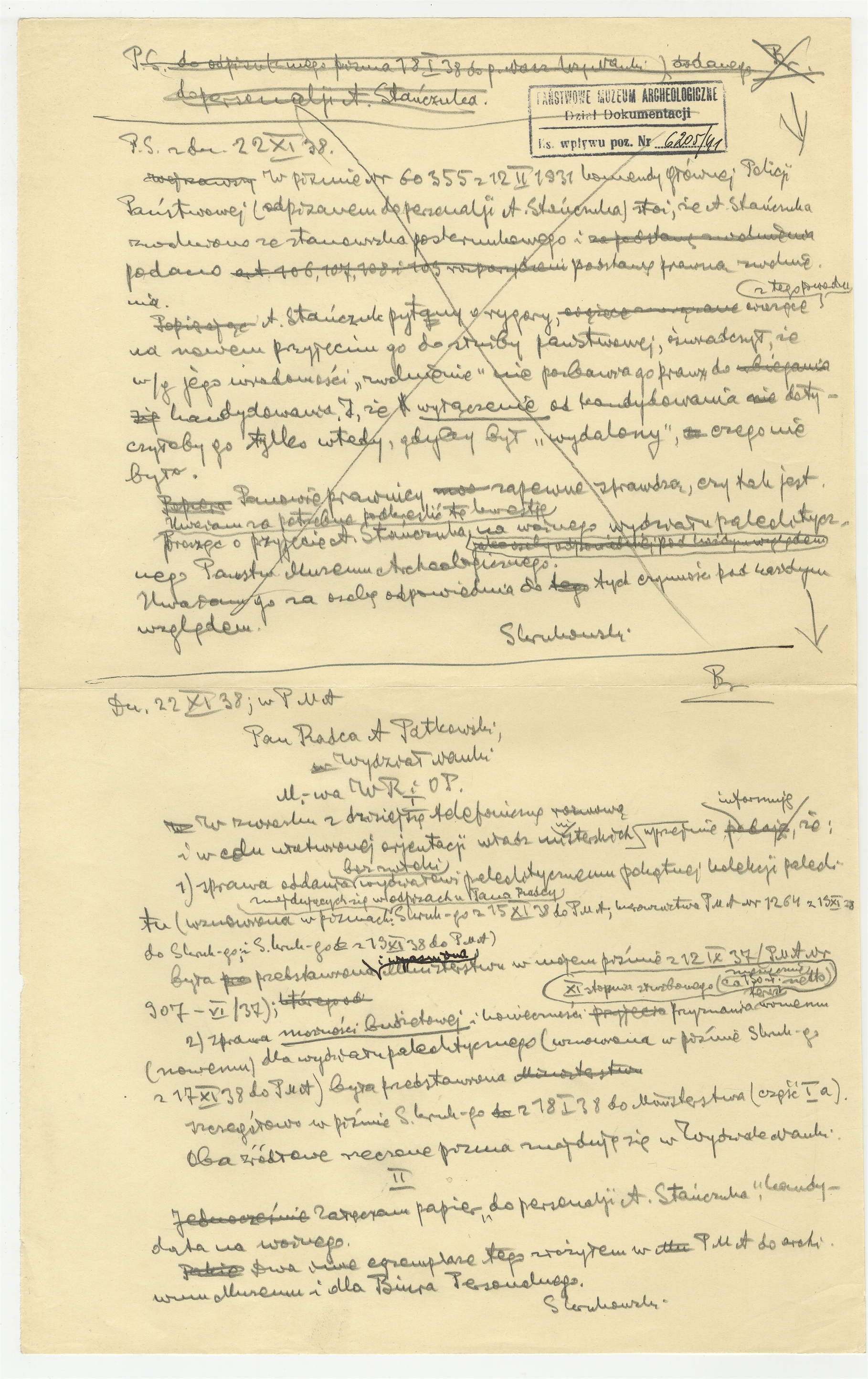 Rękopis-brudnopis pisma Stefana Krukowskiego z dn 22 XI [19]38 r. skierowanego do Radcy A. Patkowskiego "[…] w związku z dzisiejszą telefoniczną rozmową […]"
