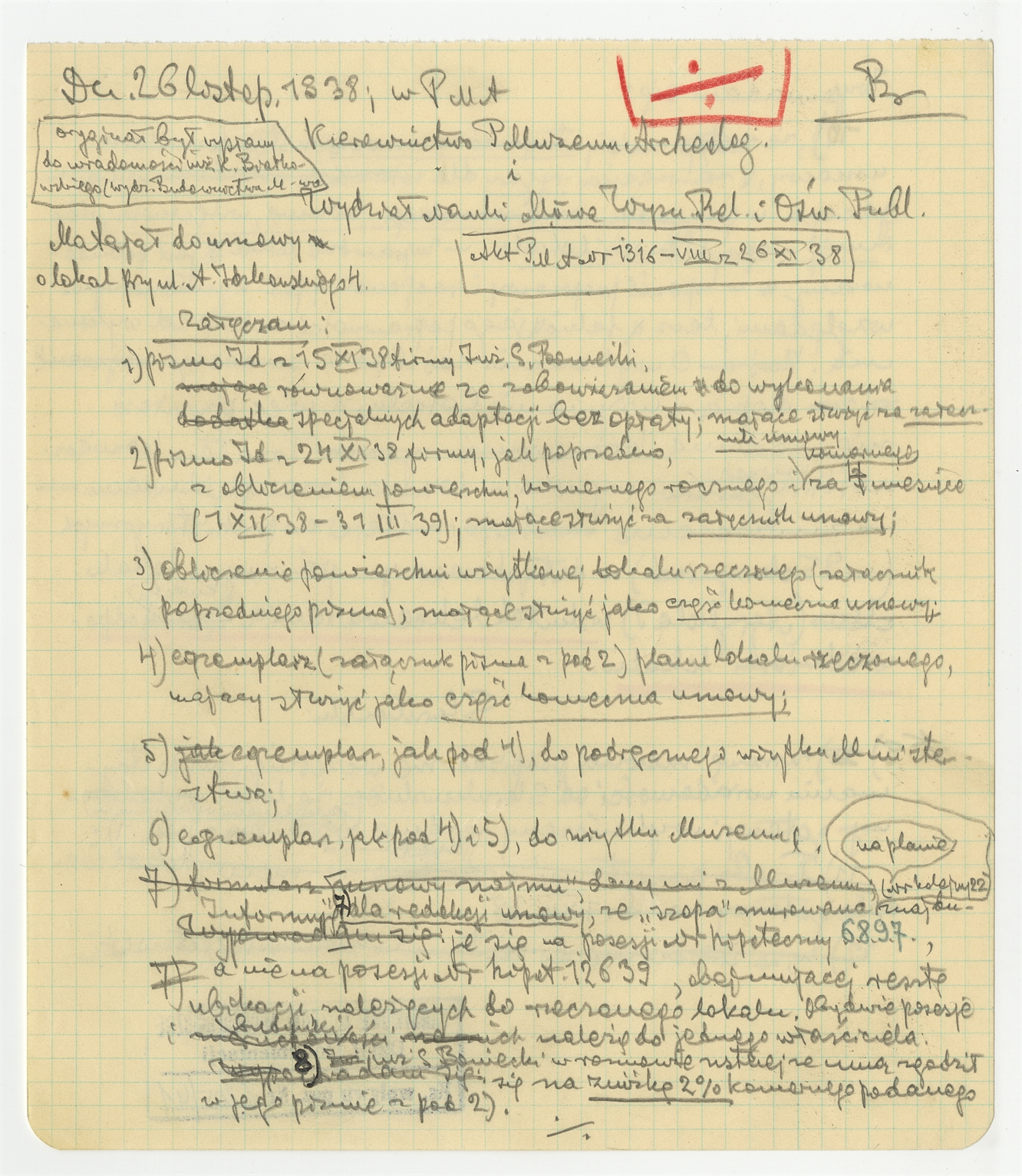 Rękopis-brudnopis pisma Stefana Krukowskiego z dn 26 XI [193]8 r. skierowanego do Kierownictwa PMA i do Wydziału Nauki Wydziału W.R. i O.P. - Materiał do umowy o lokal przy ul. A. Idźkowskiego 4