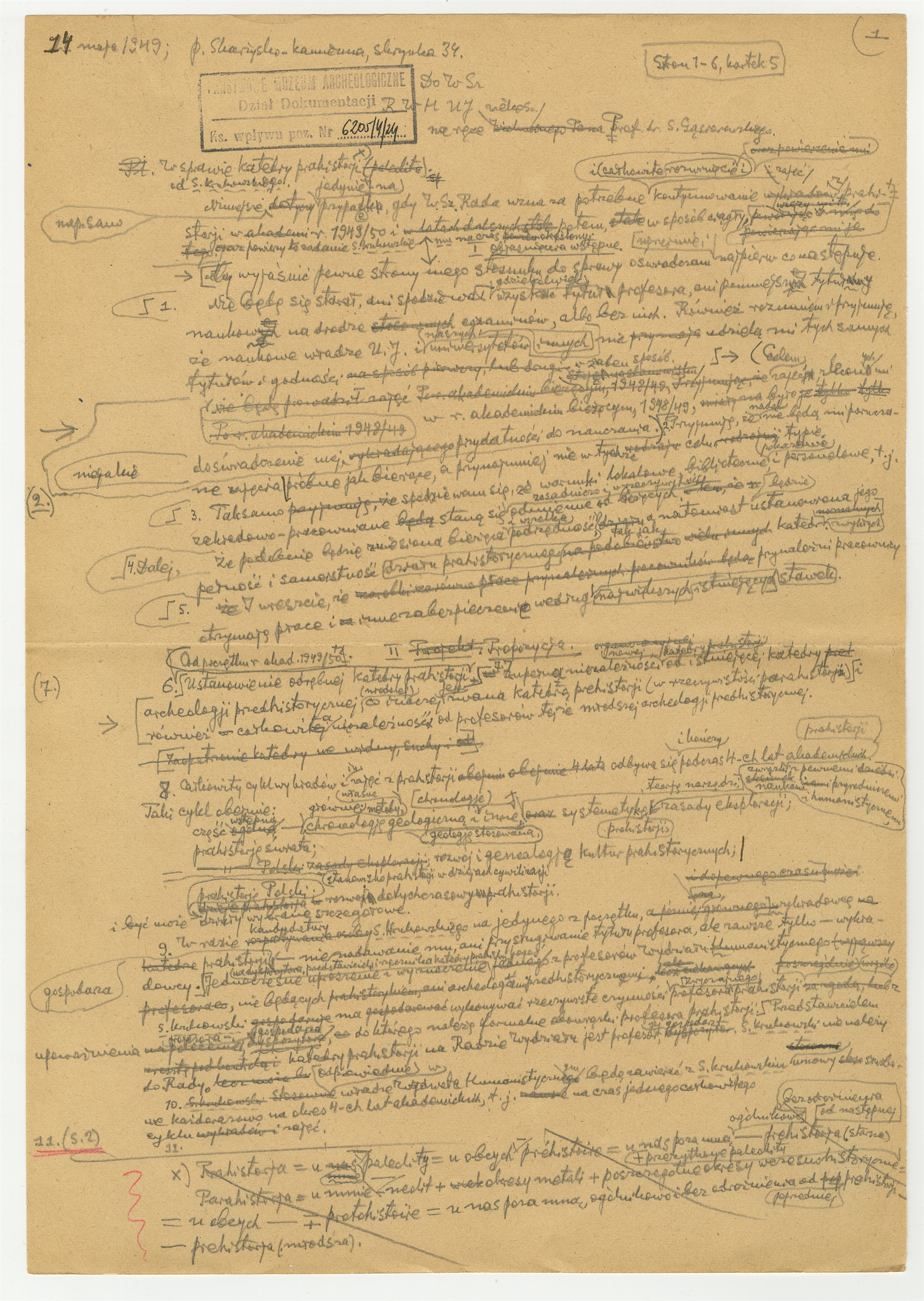 Rękopis - brudnopis pisma Stefana Krukowskiego z dnia 14 maja 1949 roku do Rady Wydziału Humanistycznego UJ w sprawie katedry prahistorii. Strona 1