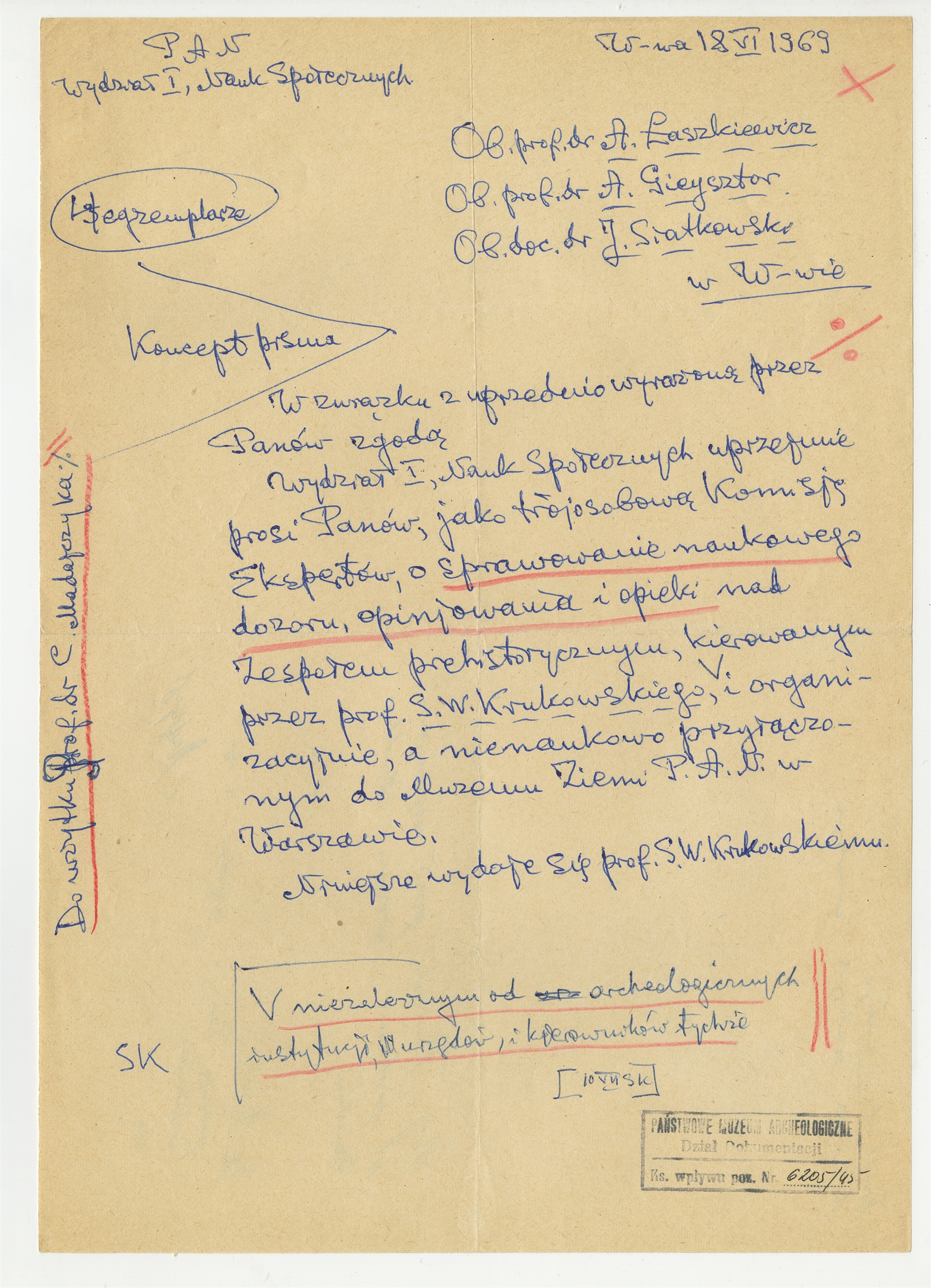Rękopis - brudnopis pisma Wydziału I Nauk Społecznych PAN do: prof. dr A. Łaszkiewicza prof. dr A. Gieysztora doc. dr J. Siatkowskiego w sprawie sprawowania naukowego dozoru opiniowania i opieki nad Zespołem prehistorycznym kierowanym przez prof. S.W. Krukowskiego - strona 1: " W związku z uprzednio" ... "instytucji urzędów i kierowników tychże" W-wa 18 VI 1969 (bez numeru strony)
