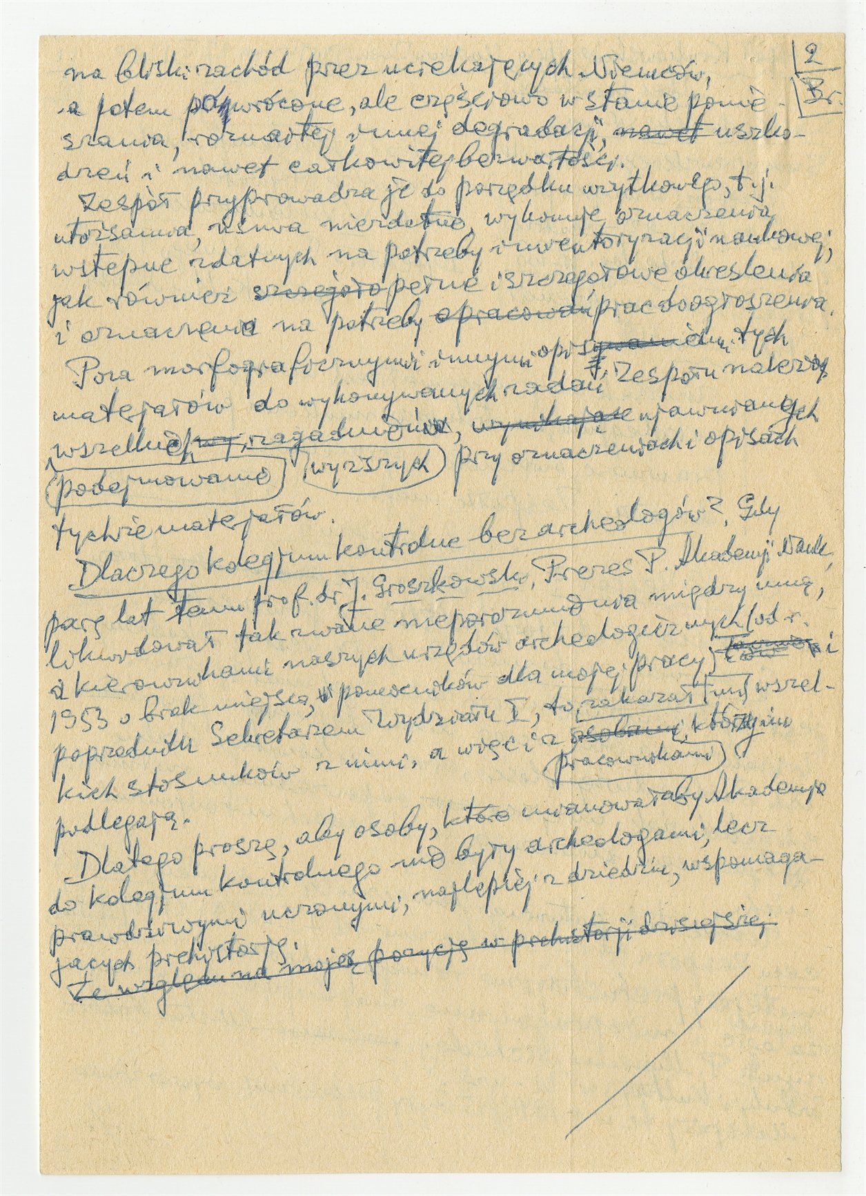 Rękopis - brudnopis pisma Zespołu Krukowskiego przy Muzeum Ziemi PAN do Dyrektora Generalnego PAN - doc. dr W. Zielenkiewicza w sprawie wniosku o wyznaczenie trzech uczonych do kolegium zajmującego się naukową kontrolą działań Zespołu (Krukowskiego) - strona 2: "na bliski zachód" ... "wpomagających prehistorję" (autorska strona 2)