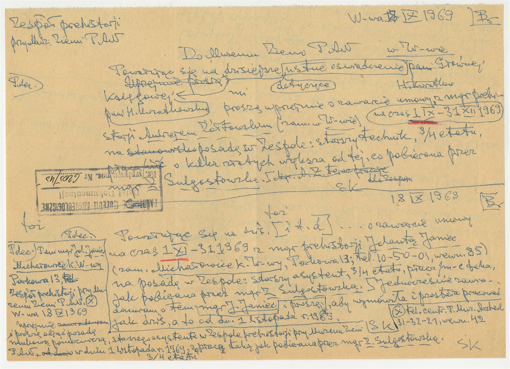 Rękopis - brudnopis pisma Zespolu prehistorji przy Muz. Ziemi PAN do "Muzeum Ziemi PAN" w sprawie zawarcia umowy z mgr prehistorji Andrzejem Żółtowskim na posadę w Zespole - strona 1: "Powołując się na" … "3/4 etatu" W-wa 18 IX 1969 (bez numeru strony)