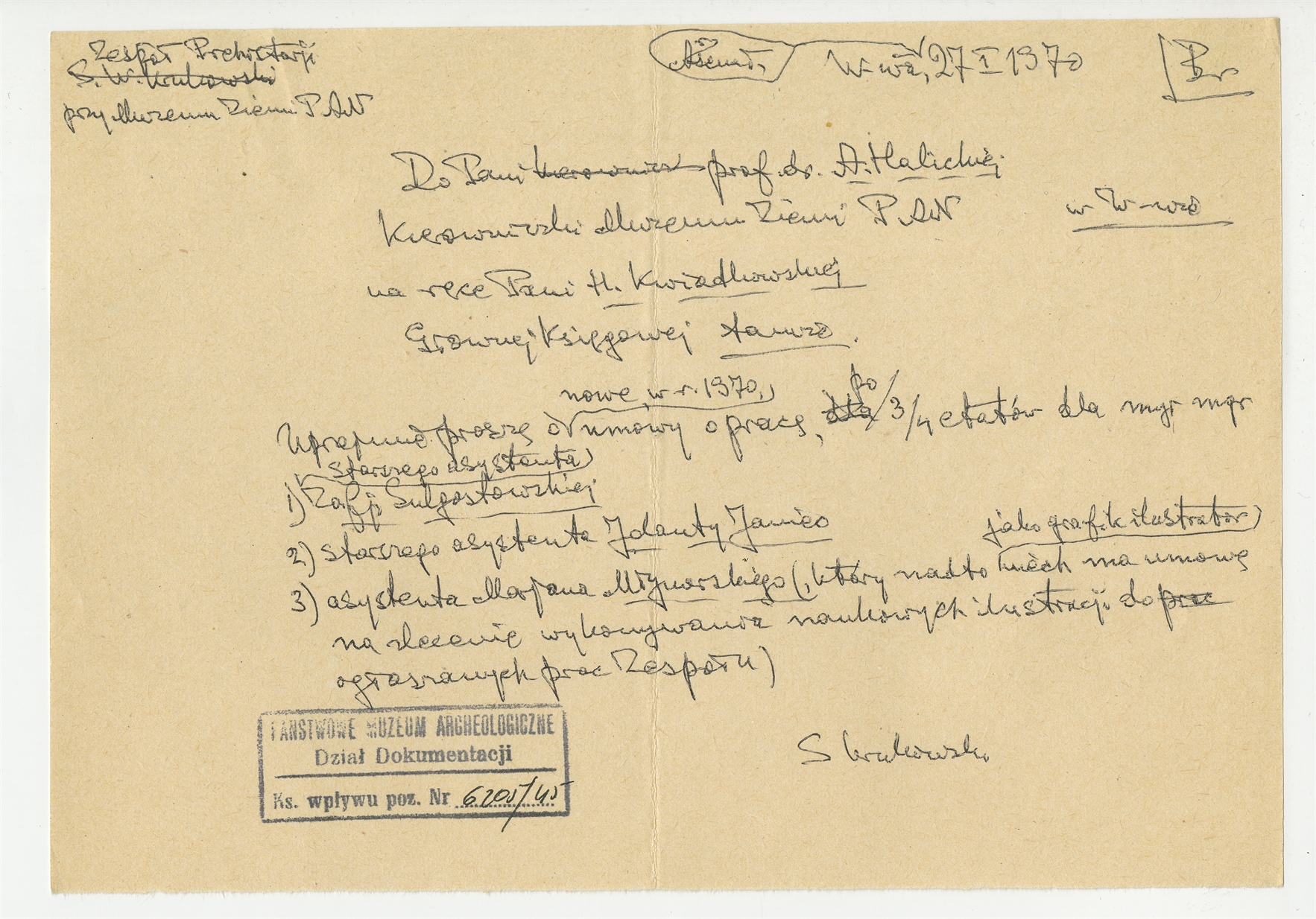 Rękopis - brudnopis pisma Zespołu Prehistorji przy Muzeum Ziemi do Kierowniczki Muzeum Ziemi PAN prof. dr A.Halickiej oraz głównej księgowej H. Kwiatkowskiej w sprawie umów o pracę dla Zofji Sulgostowskiej Jolanty Janiec i Marjana Młynarskiego - strona 1: "Uprzejmie proszę o nowe umowy" ... "ilustracji do ogłoszonych prac Zespołu" W-wa Arsenał 27 I 1970 (bez numeru strony)