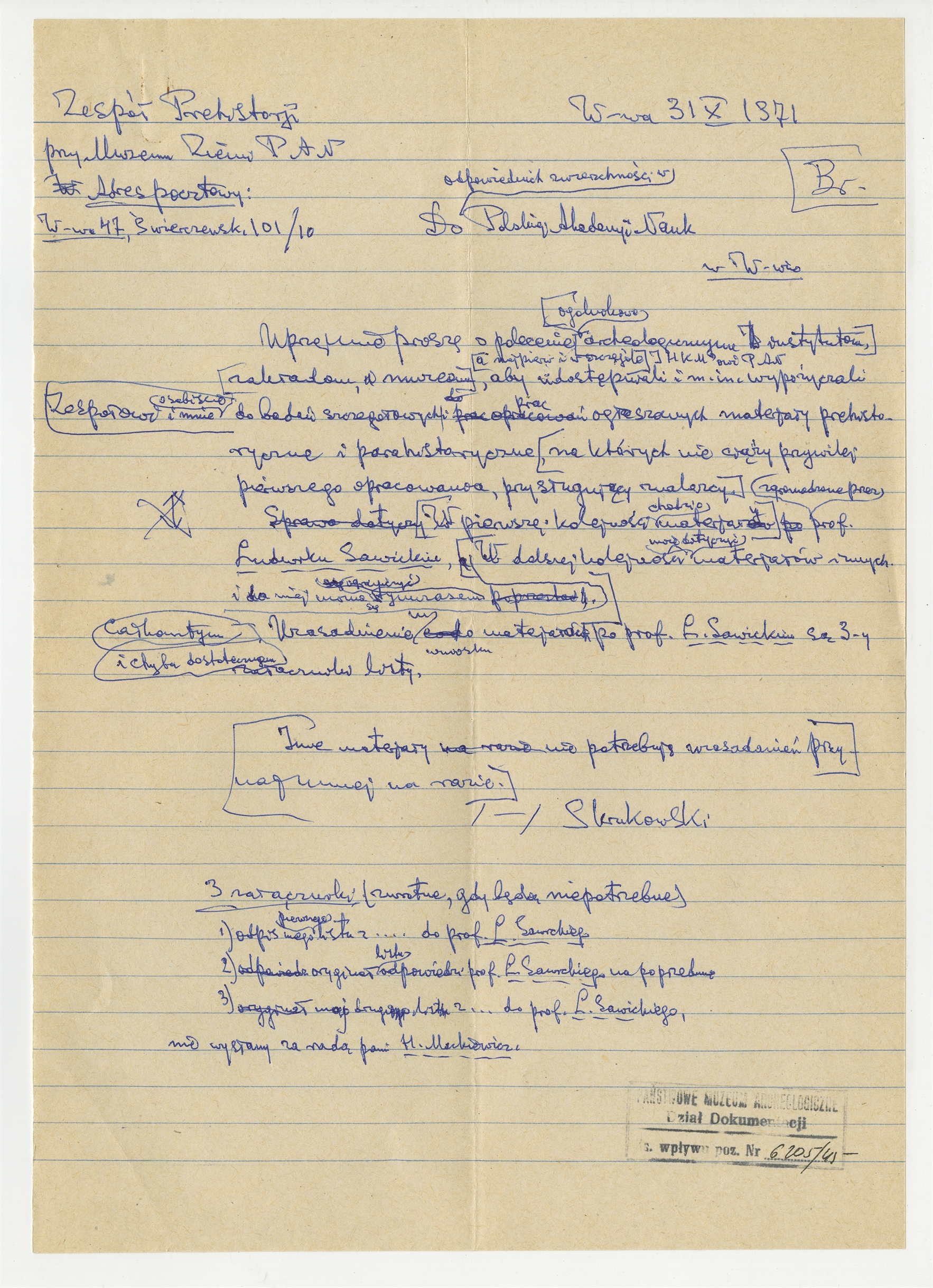 Rękopis - brudnopis pisma Zespołu Prehistorji przy Muzeum Ziemi PAN "Do odpowiednich zwierzchności Polskiej Akademji Nauk" w sprawie udostępniania Zespołowi do badań szczegółowych prac ogłaszanych materiałów prehistorycznych i parahistorycznych - strona 1: "Uprzejmie proszę o polecenie" ... "nie wysłany za radą pani H. Markiewicz" W-wa 31 X 1971 (bez numeru strony)