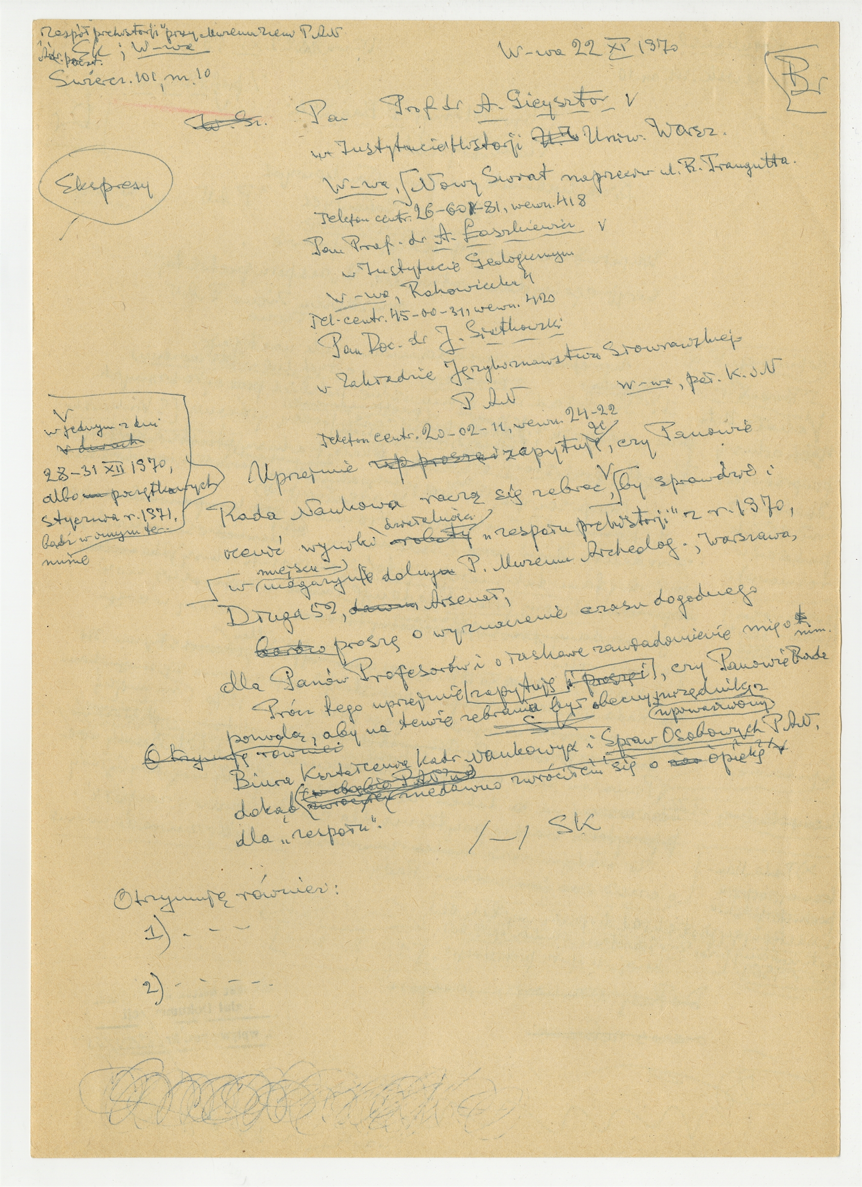 Rękopis - brudnopis pisma Zespołu Prehistorji przy Muzeum Ziemi PAN do prof. dr A. Gieysztora do prof. dr A. Łaszkiewicaza do doc. dr J. Siatkowskiego w sprawie zebrania się Rady Naukowej - strona 1: "Uprzejmie zapytuję" … "opiekę dla "zespołu"" W-wa 22 XI 1970 (bez numeru strony)