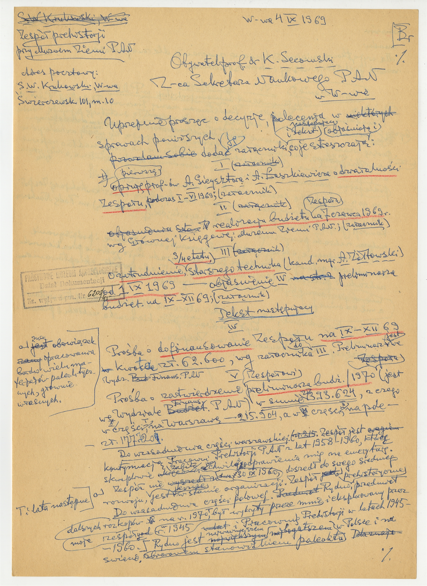 Rękopis - brudnopis pisma Zespołu prehistorji przy Muzeum Ziemi PAN do prof. dr K. Secowskiego w sprawie: opinii o działalności Zespołu zatrudnienia starszego technika dofinansowania Zespołu oraz nadania nazwy Zespołowi - strona 1: zatytułowana "Obywatel prof. dr K Secowski / Z-ca Sekretarza Naukowego PAN w Warszawie W-wa 4 IX 1969 (bez numeru autorskiej strony)