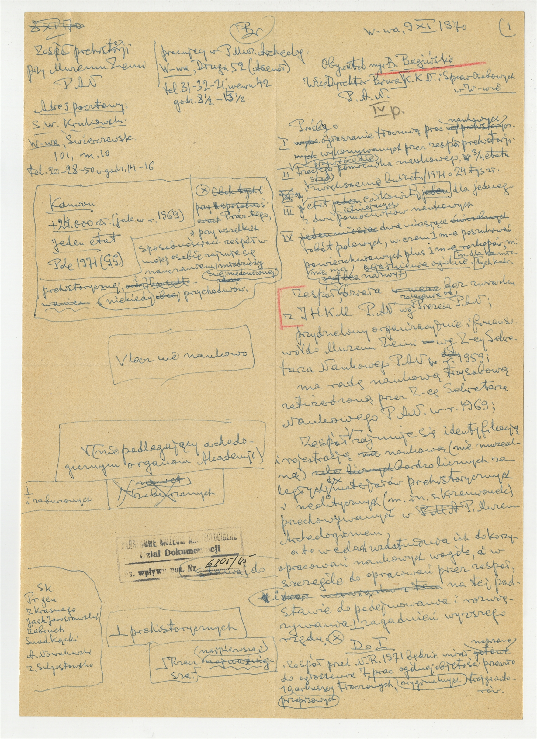 Rękopis - brudnopis pisma Zespołu prehistorji przy Muzeum Ziemi PAN do Wice Dyrektora Biura K.K.N. i Spraw Osobowych PAN w sprawie prośby o ogłoszenie tłocznią prac naukowych wykonywanych przez zespół prehistorji przywrócenie pracownika naukowego zwiększenie budżetu na rok 1971 wyznaczenie dwóch miesięcy praktyk polowych dla potrzeb dydaktycznych - strona 1: zatytułowana "Obywatel mgr B. Bagiński ..." "Prośby o" ... "trojga autorów" W-wa 9 XI 1970 (autorska strona 1)