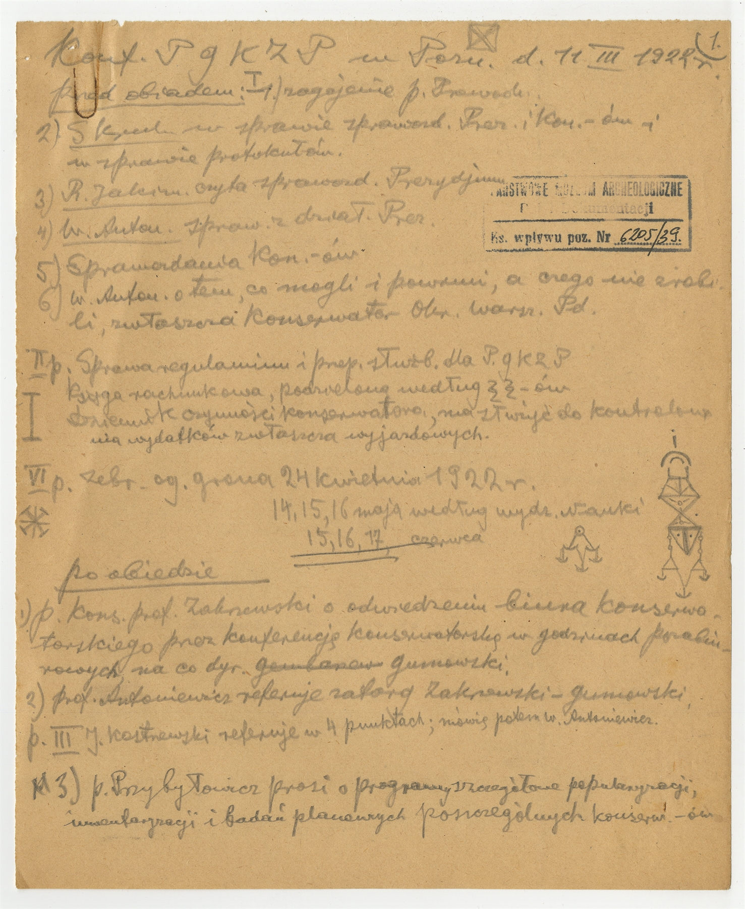 Rękopis - brudnopis planu konferencji Państwowego Grona Konserwatorów Zabytków Przedhistorycznych w Poznaniu dnia 11 marca 1922 r. - strona 1: "Przed obiadem" "Po obiedzie"
