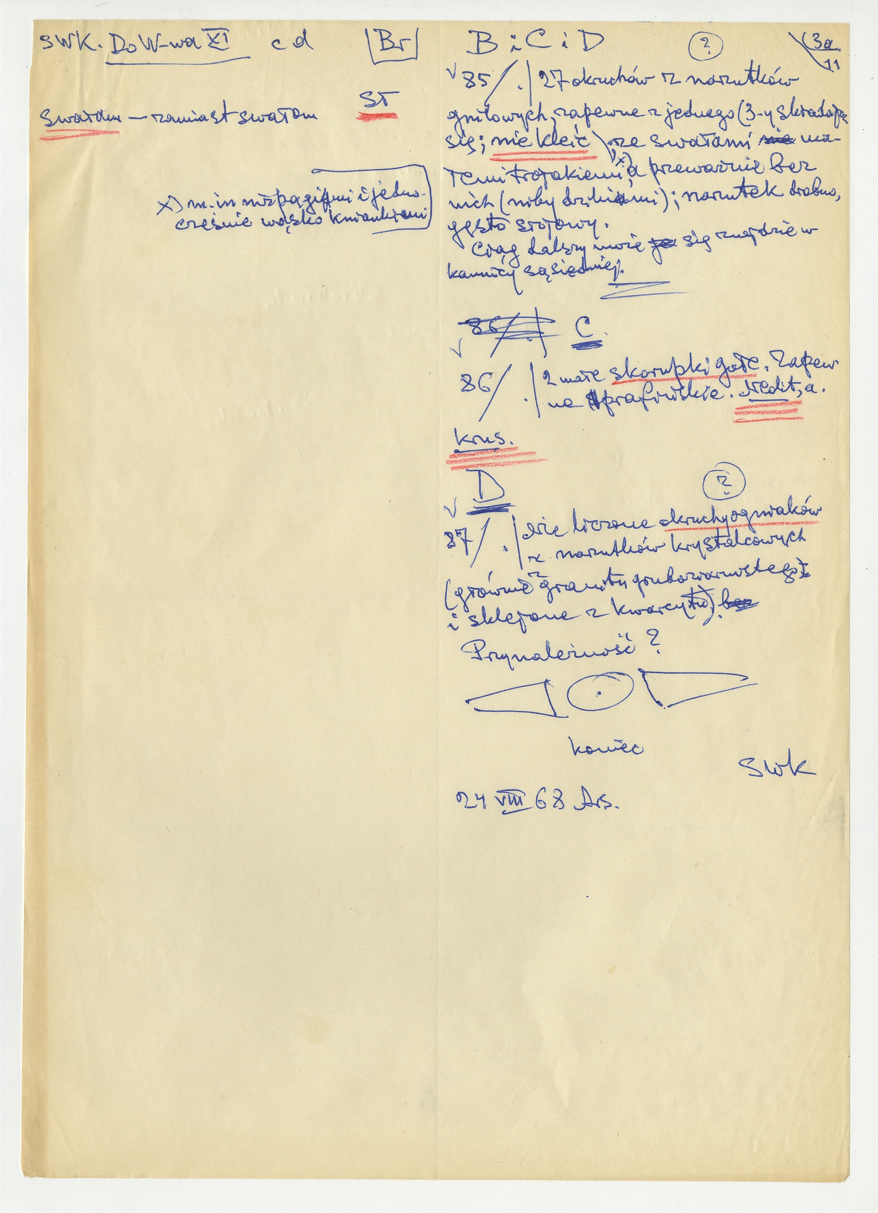 Rękopis - brudnopis pracy "Do Wieliszewa XI" Rozdział I. "Opisy swaków kamnicy 1" sporządzony w sierpniu 1968 r. - strona 11: "B. Dziartaki" c.d. (pkt. 85-87) oraz materiał do słownika 24 VIII [19]68