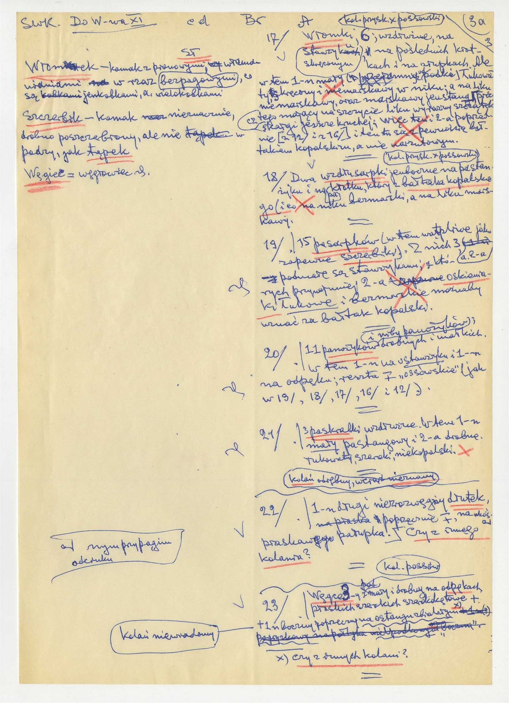 Rękopis - brudnopis pracy "Do Wieliszewa XI" Rozdział I. "Opisy swaków kamnicy 1" sporządzony w sierpniu 1968 r. - strona 3: "A. Krzemaki" c.d. (pkt. 17-23) oraz materiał do słownika