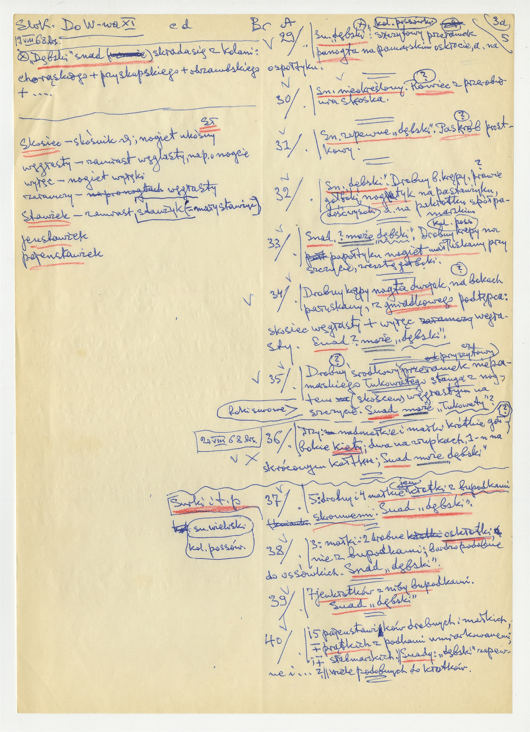 Rękopis - brudnopis pracy "Do Wieliszewa XI" Rozdział I. "Opisy swaków kamnicy 1" sporządzony w sierpniu 1968 r. - strona 5: "A. Krzemaki" c.d. (pkt. 29-40) oraz materiał do słownika 19-20 VIII [19]68