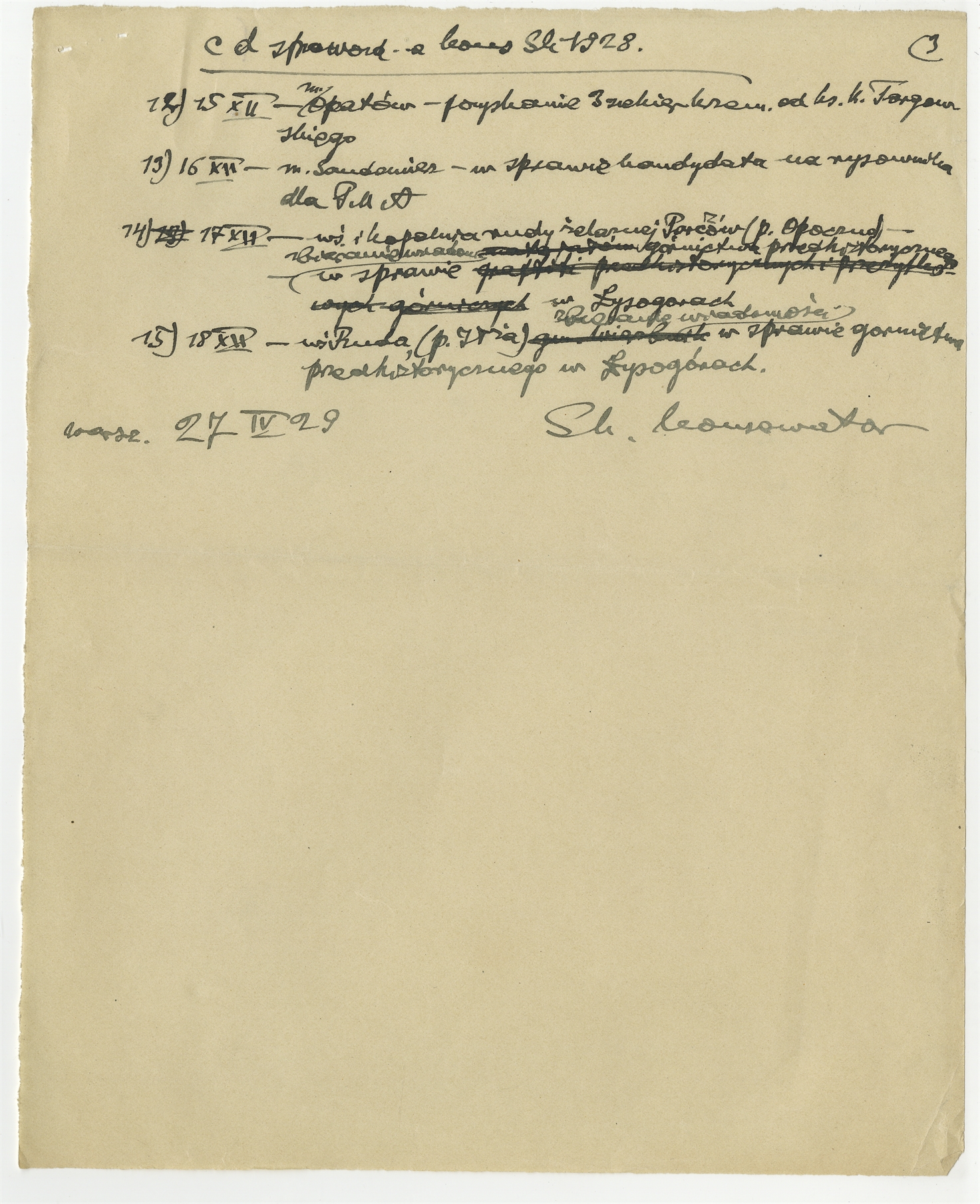 Rękopis - brudnopis pracy "Materyał do sprawozdania z działalności konserwatora SK za r. 1928" Warszawa 27 IV [19]29 r. - strona 3: "(…) 12) 15 XII - m. Opatów - pozyskanie 3 siekier krzem. od ks. K. Targowskiego (…)"