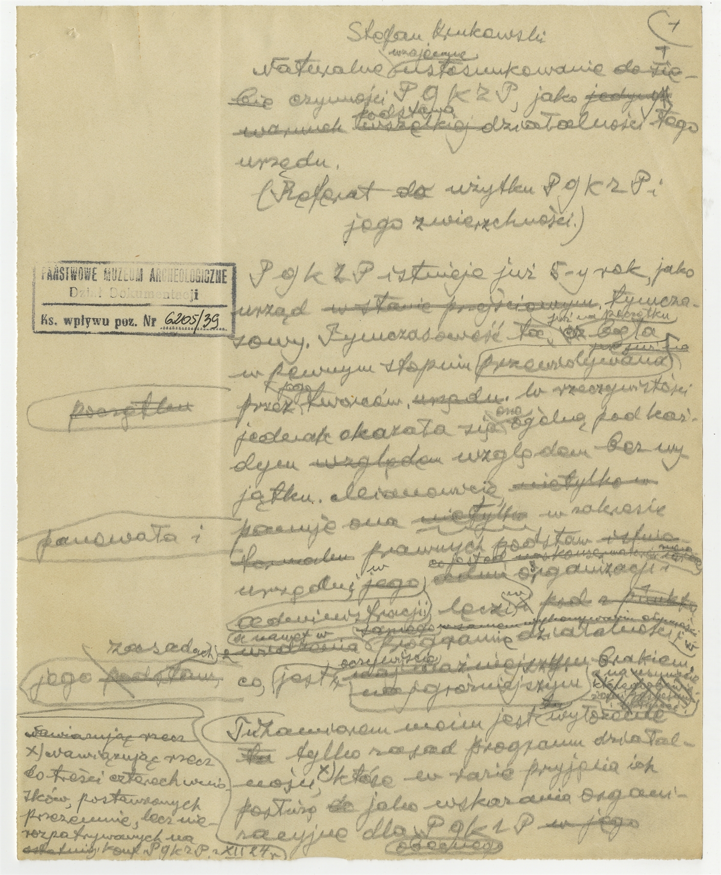 Rękopis - brudnopis pracy "Naturalne wzajemne ustosunkowanie czynności PGKZP jako podstawa działalności tego urzędu (Referat dla użytku PGKZP i jego zwierzchności)" - strona 1: "PGKZP istnieje już 5-y rok (…)"