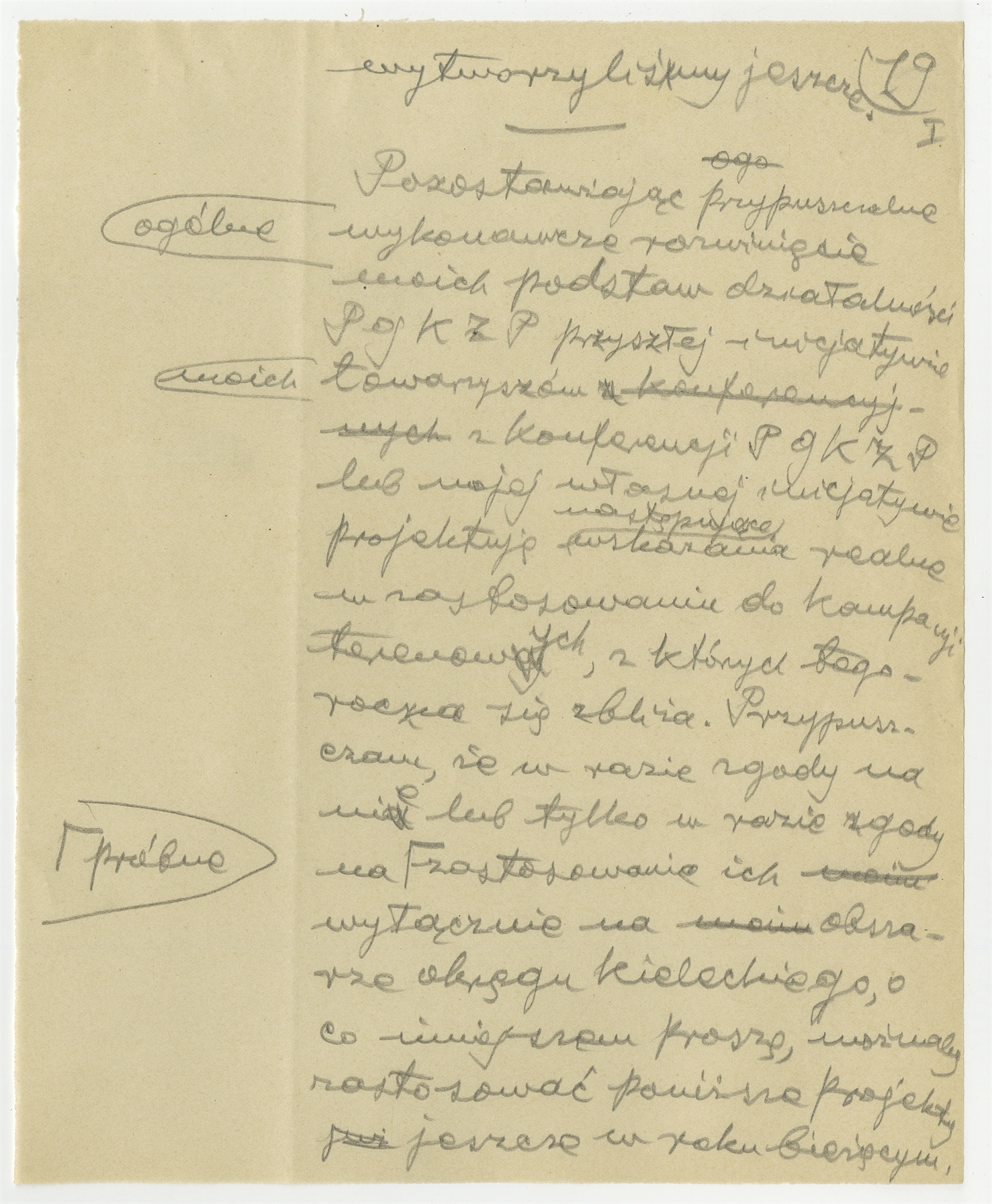 Rękopis - brudnopis pracy "Naturalne wzajemne ustosunkowanie czynności PGKZP jako podstawa działalności tego urzędu (Referat dla użytku PGKZP i jego zwierzchności)" - strona 19: "(…) Pozostawiając przypuszczalne ogólne wykonawcze rozwinięcie (…)"