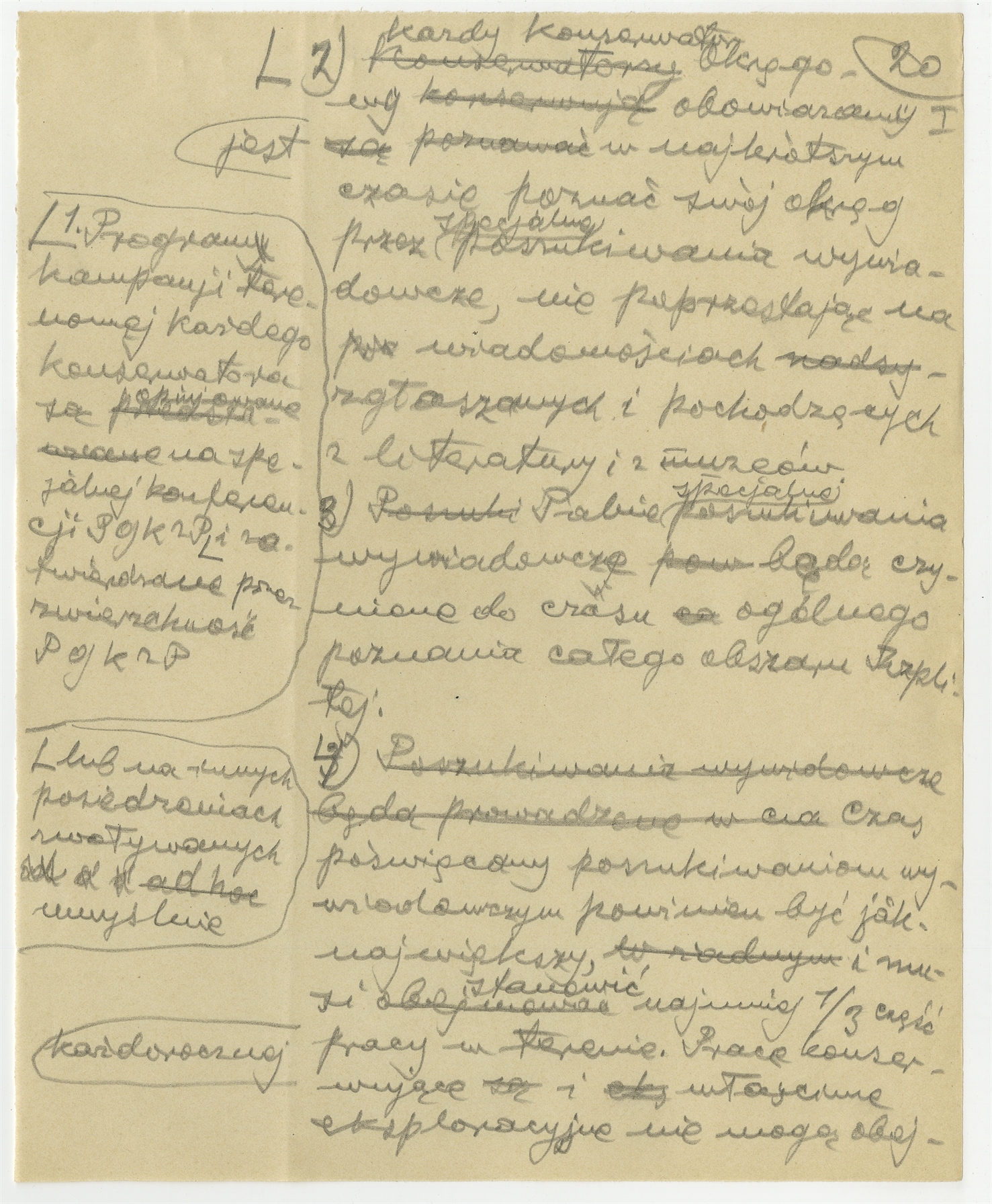 Rękopis - brudnopis pracy "Naturalne wzajemne ustosunkowanie czynności PGKZP jako podstawa działalności tego urzędu (Referat dla użytku PGKZP i jego zwierzchności)" - strona 20: "(…) 2) każdy konserwator okręgowy obowiązany jest (…)"