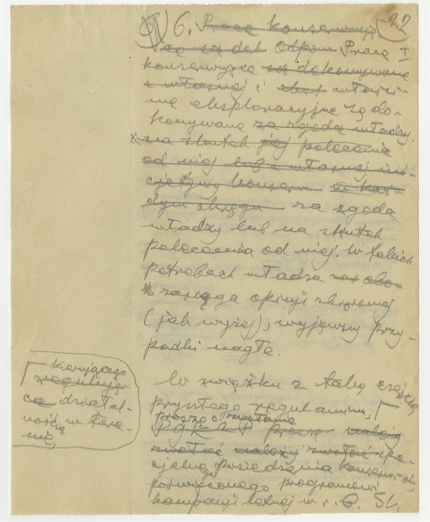 Rękopis - brudnopis pracy "Naturalne wzajemne ustosunkowanie czynności PGKZP jako podstawa działalności tego urzędu (Referat dla użytku PGKZP i jego zwierzchności)" - strona 22: "(…) 6. Prace konserwujące i właściwe eksploracyjne (…)"