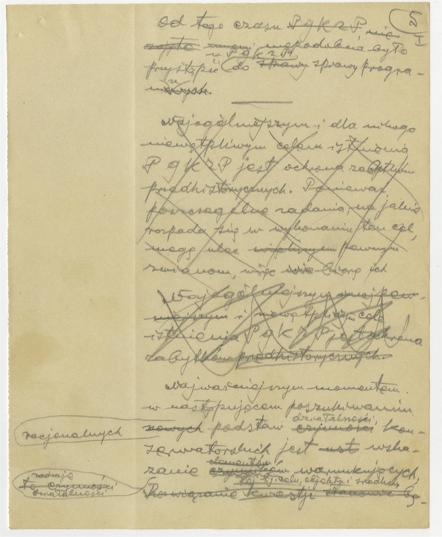 Rękopis - brudnopis pracy "Naturalne wzajemne ustosunkowanie czynności PGKZP jako podstawa działalności tego urzędu (Referat dla użytku PGKZP i jego zwierzchności)" - strona 5: "(…) Od tego czasu niepodobna było przystąpić (…)"