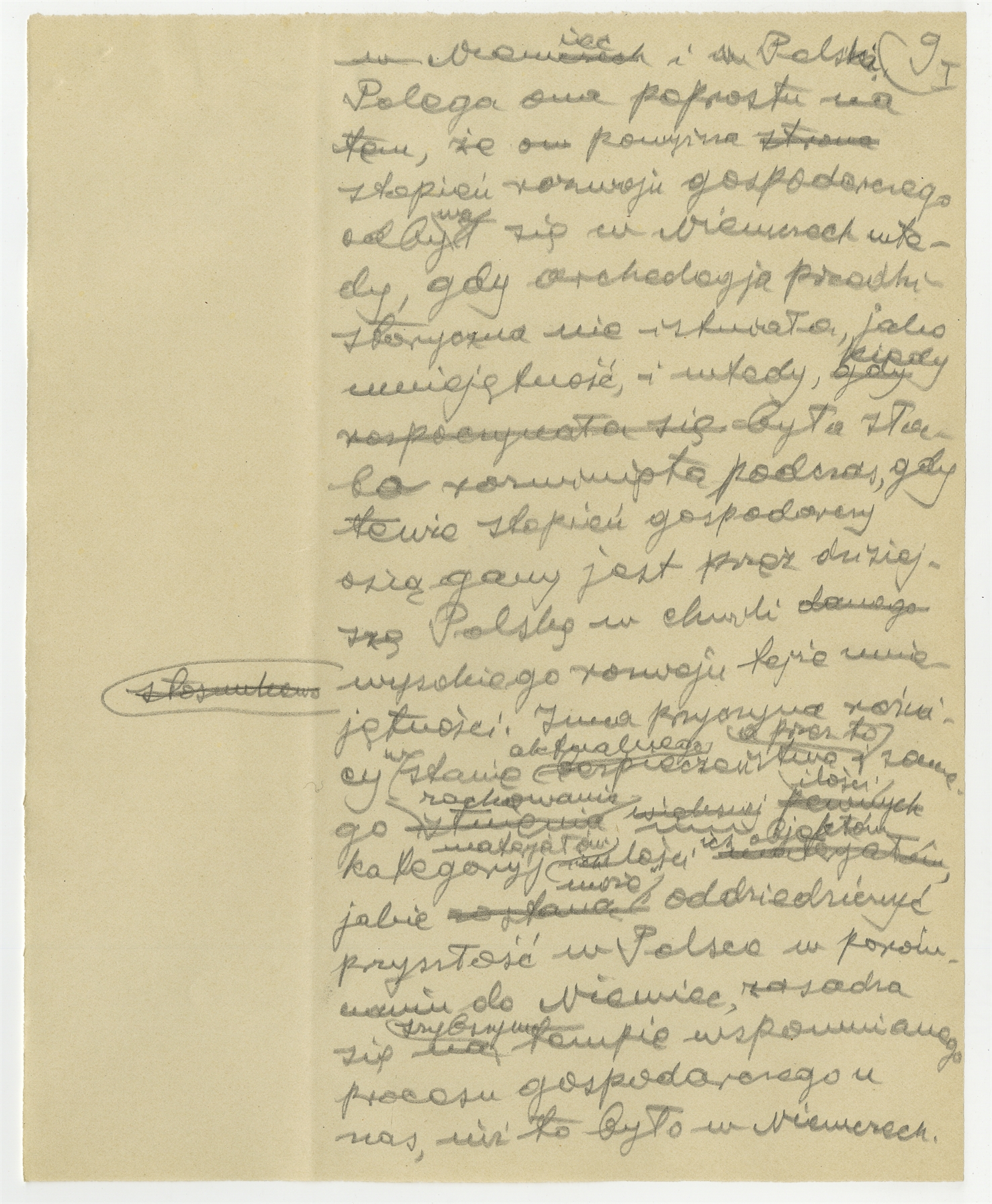 Rękopis - brudnopis pracy "Naturalne wzajemne ustosunkowanie czynności PGKZP jako podstawa działalności tego urzędu (Referat dla użytku PGKZP i jego zwierzchności)" - strona 9: "(…) Niemiec i Polski. Polega ona po prostu na tem że (…)"