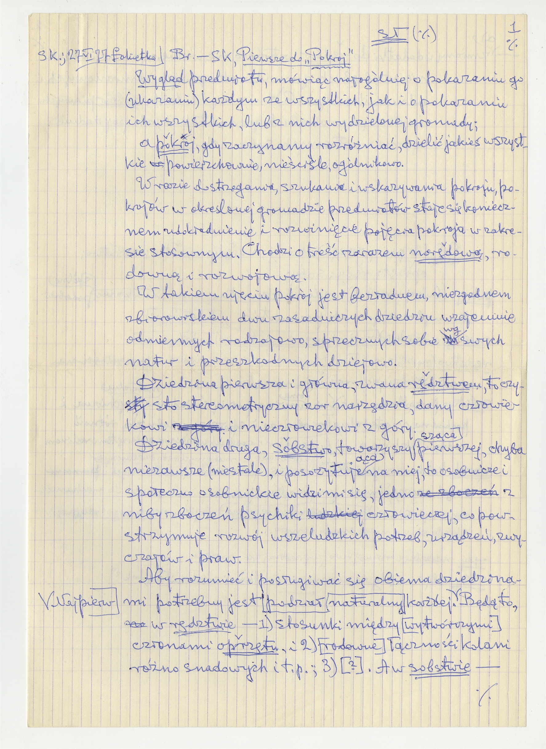 Rękopis - brudnopis pracy "Pierwsze do 'Pokrój'" - strona 1: "Wygląd przedmiotu mówiąc najogólniej (…)" 27 VI [19]77