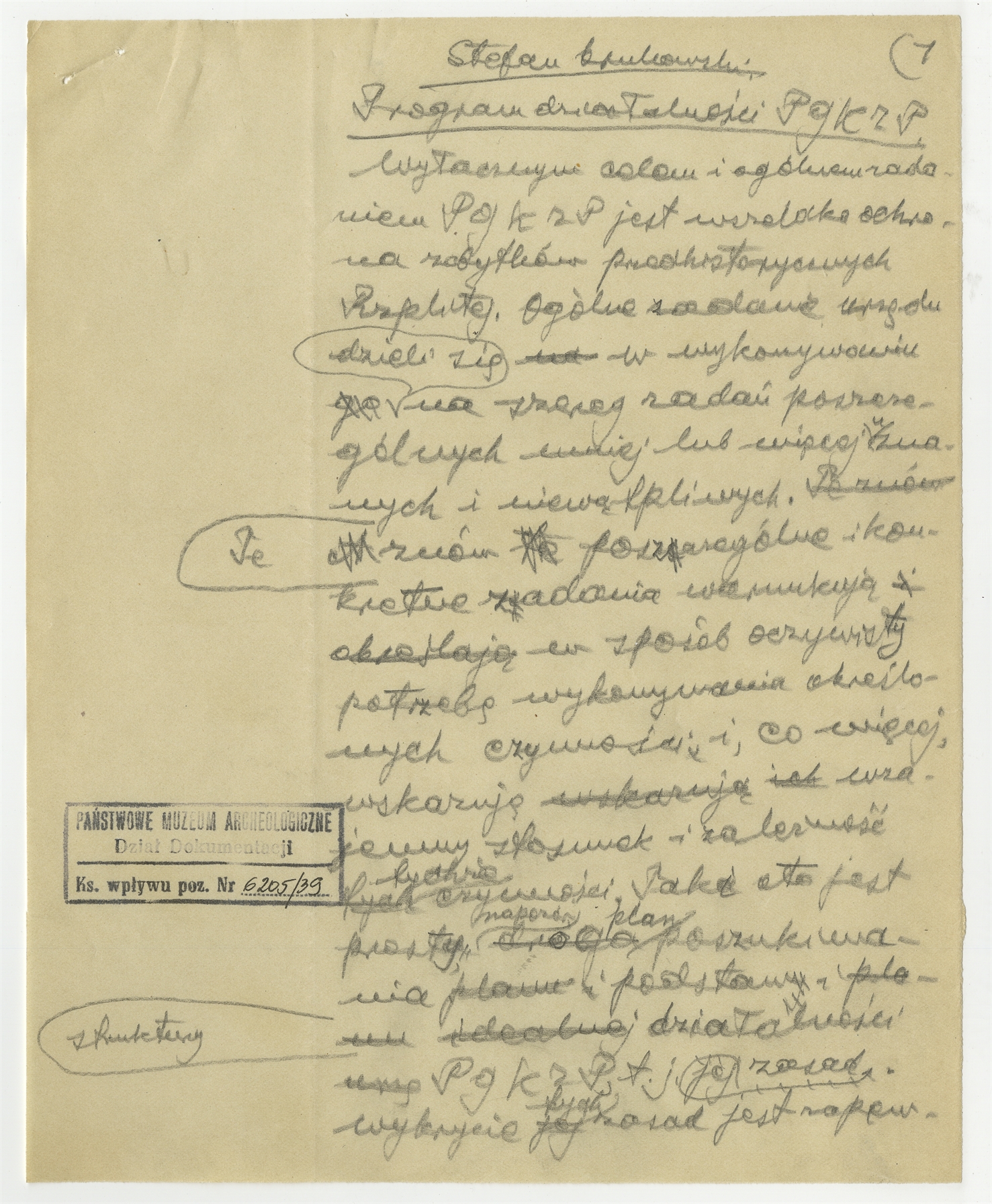 Rękopis - brudnopis pracy "Pragram działalności PGKZP" - strona 1: "Wyłącznym celem i ogólnem zadaniem PGKZP (…)"