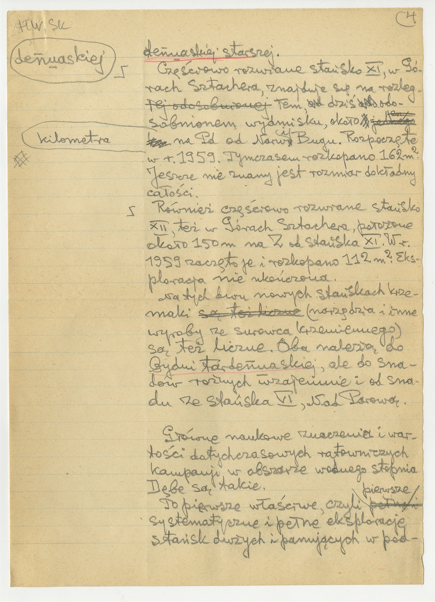 Rękopis – brudnopis „sprawozdania polowego z kampanii Dębe 1959” 12 marca 1960 r. autorska numeracja: 4 str. 4: „Częściowo rozwiane stanowisko XI (...)”