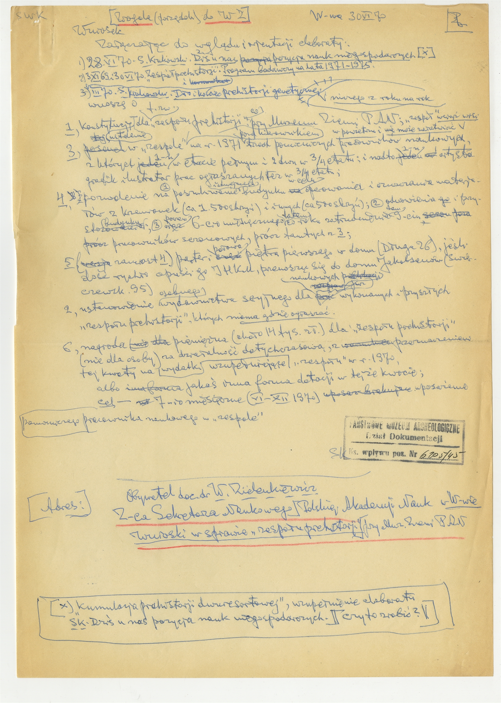 Rękopis - brudnopis wniosku S. Krukowskiego do Z-cy Sekretarza Naukowego Polskiej Akademji Nauk doc. dr W. Zielenkiewicza w sprawach "Zespołu Prehistorji" przy Muzeum Ziemi PAN - strona 1: zatytułowana "Wniosek" [W ogóle (porządek) do WZ] W-wa 30 VI [19]70 (bez numeru strony)