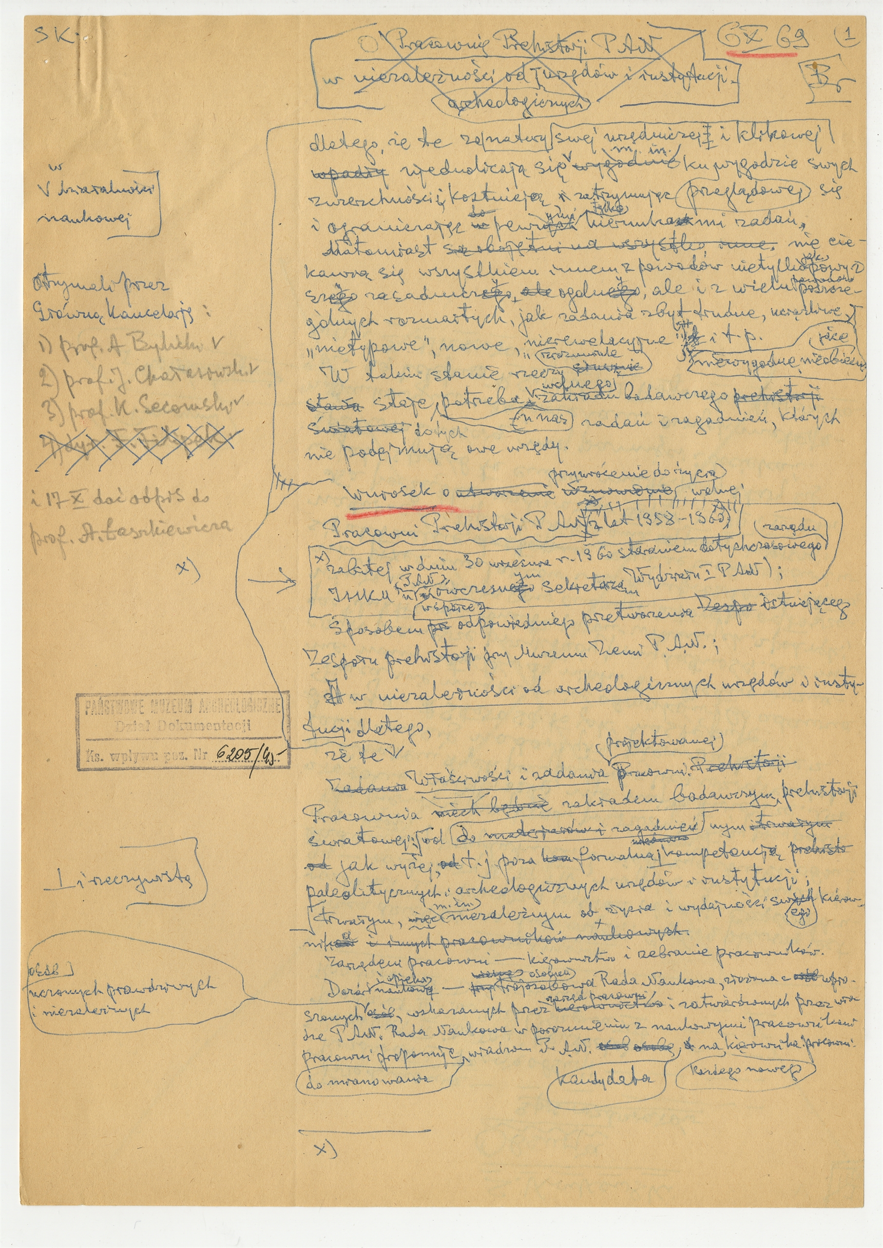 Rękopis - brudnopis wniosku S. Krukowskiego o przywrócenie do życia Pracowni Prehistorji P.A.N - strona 1: zatytułowana "O Pracownię Prehistorji PAN w niezależności od urzędów i instytucji archeologicznych "dlatego że te" … "na każdego nowego kierownika pracowni" 6 X [19]69 (autorska strona 1)