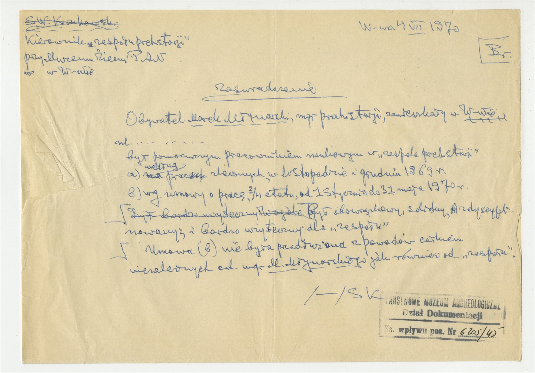 Rękopis - brudnopis zaświadczenia sporządzonego przez S. Krukowskiego odnośnie Marka Młynarskiego i jego pracy w "zespole prehistorji" - strona 1: zatytułowana "Zaświadczenie" "Obywatel Marek Młynarski" … "jak rónież od "zespołu"" W-wa 4 VII 1970