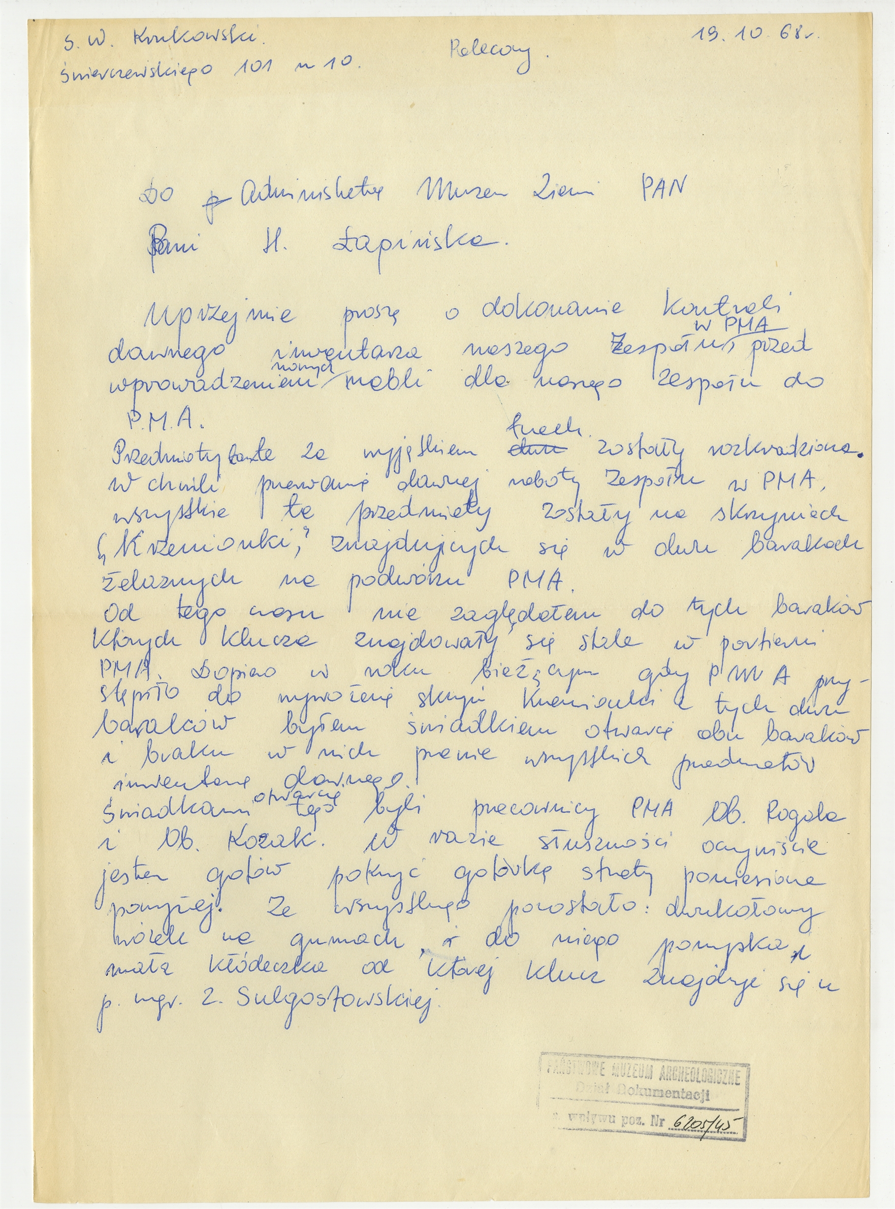 Rękopis brudnopisu listu Stefana Krukowskiego "Do Adminisketory Muzeum Ziemi PAN - Pani H. Łapińskiej" w sprawie dokonania kontroli dawnego inwentarza Zespołu PMA z dn. 19.10. [19]68 r.