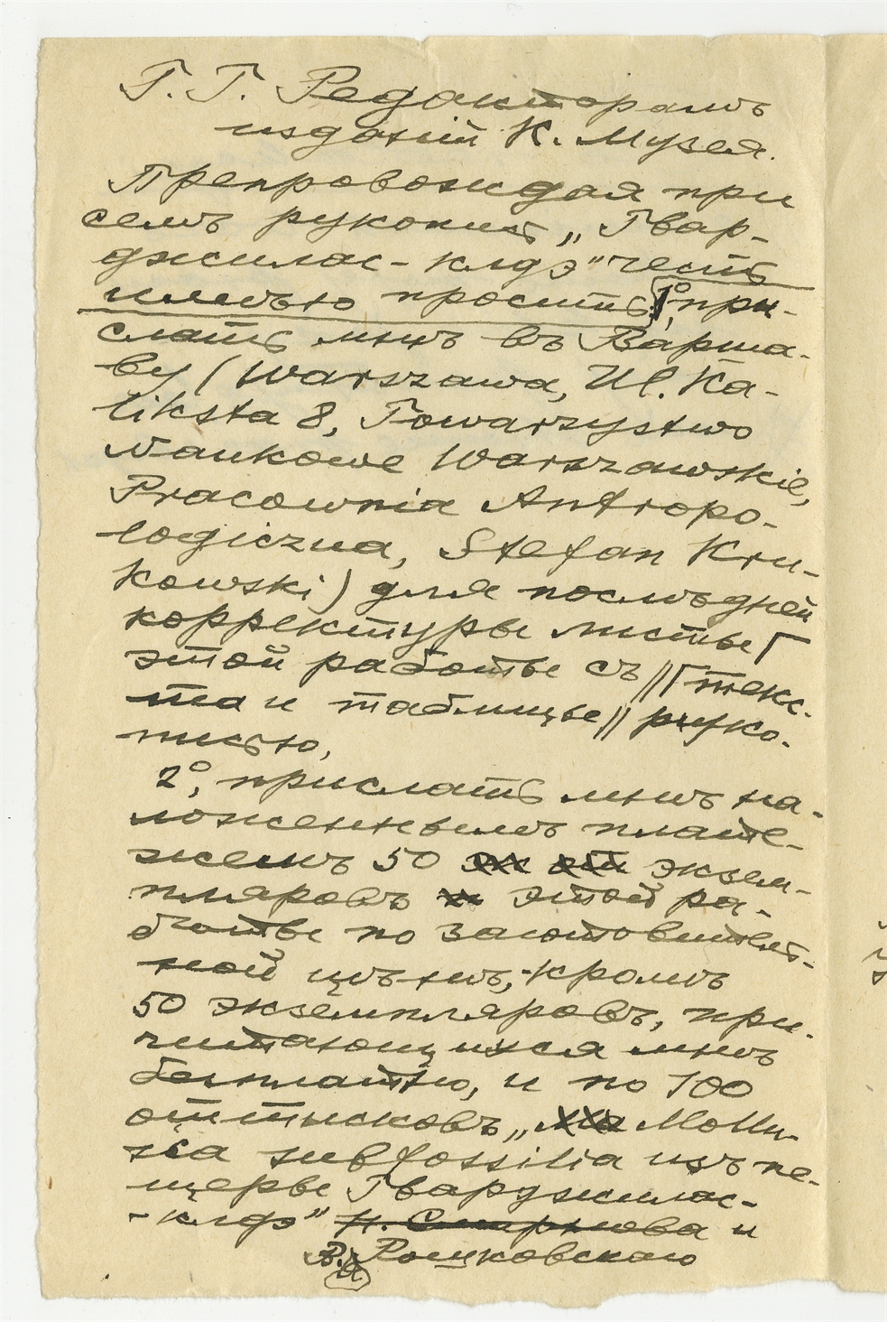 Rękopis - budnopis listu Stefana Krukowskiego w języku rosyjskim do redakcji wydawnictwa w Muzeum Gruzji z dnia 15 czerwca 1918 roku