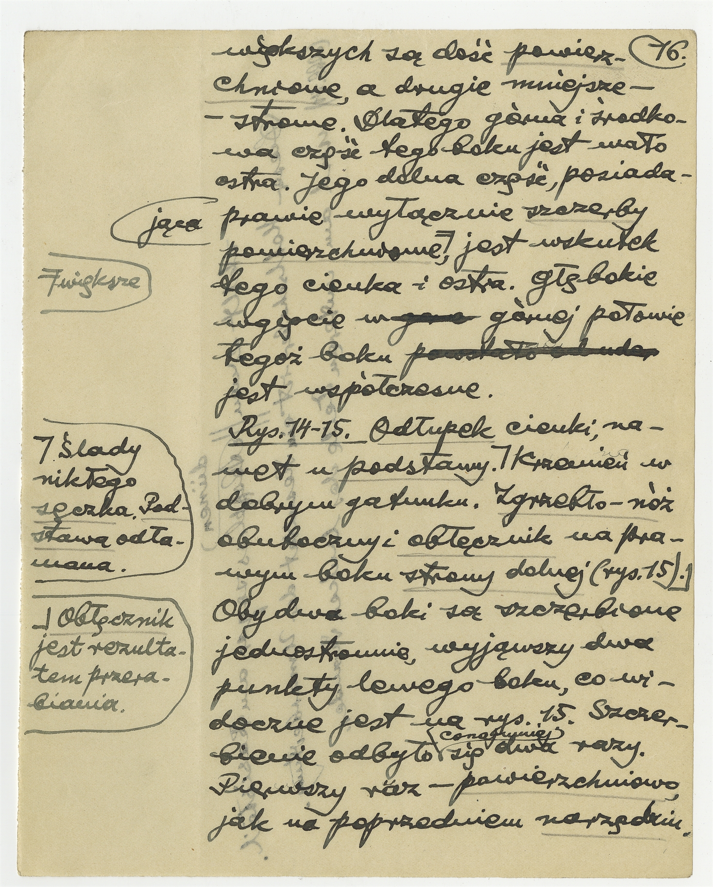 Rękopis części pracy zatytułowanej "II. Część prahistoryczna" wchodzącej w skład opracowania S. Krukowskiego oraz J. Polańkiego pt. "Pierwsze stanowisko paleolityczne w Nowosiółce Kostiukowej (Podole)" - strona 16: "Narzędzia z odłupkiem" c.d.